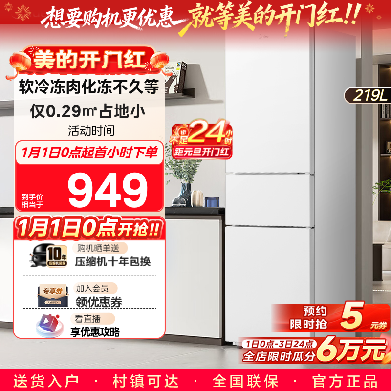 美的230三开门白色超薄家用小型宿舍租房冷藏电冰箱官方节能低音