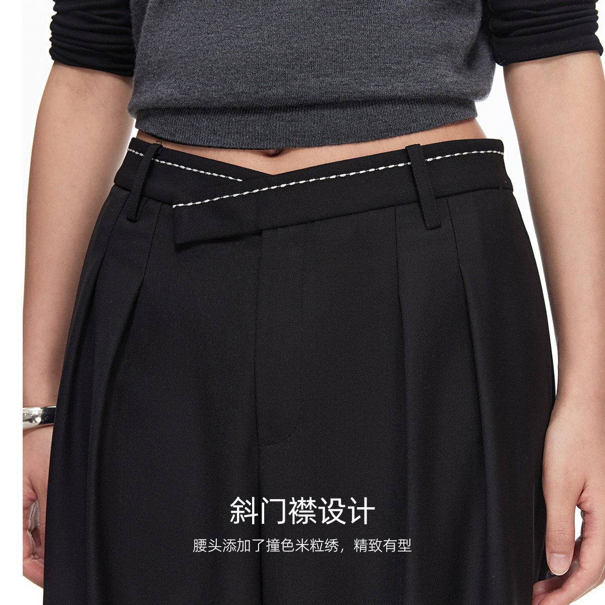 MissWiss直筒裤子女2025新款长裤休闲高腰收腹提臀黑色垂感阔腿裤