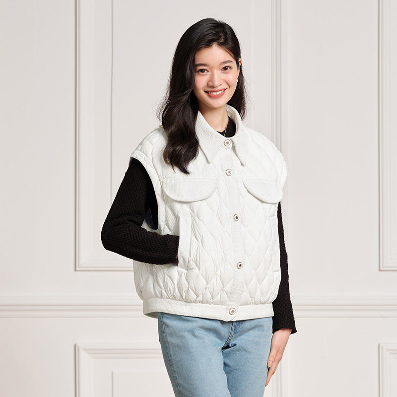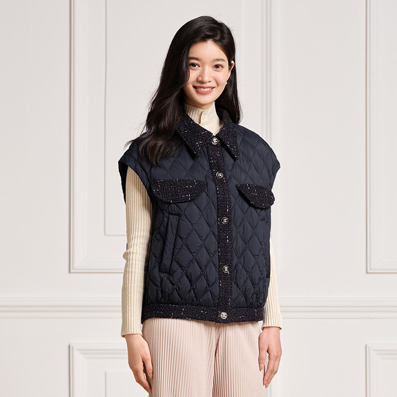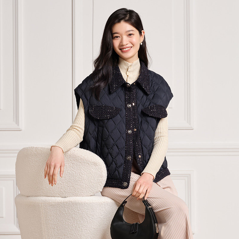 坦博尔奥莱官方正品小香风羽绒马甲女短款轻薄无袖拼接翻领外套潮