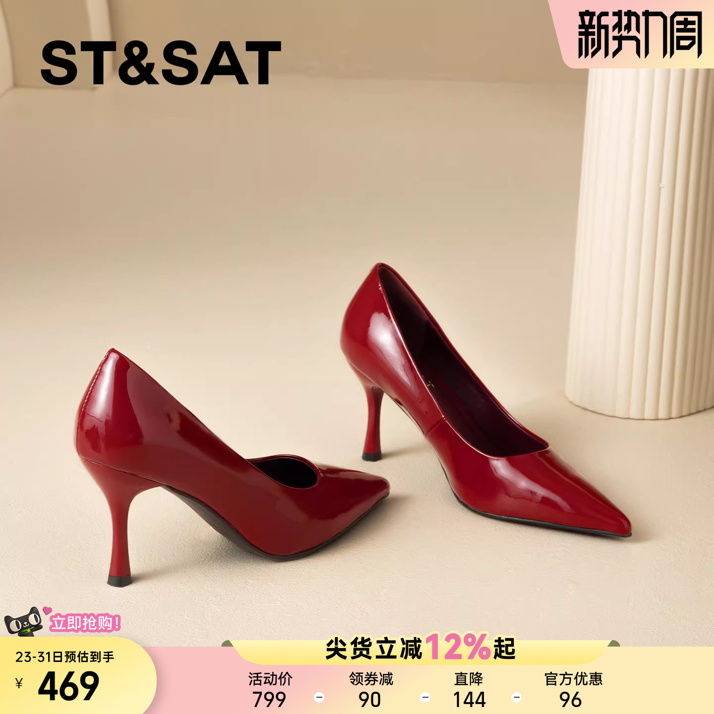 星期六真皮性感红色尖头细跟高跟女2026年春季新款不累脚浅口单鞋