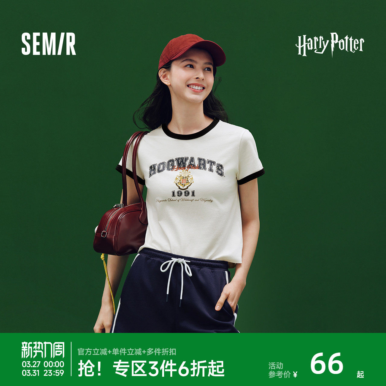 森马哈利波特联名短袖T恤女夏季短款撞色修身正肩印花学院风上衣