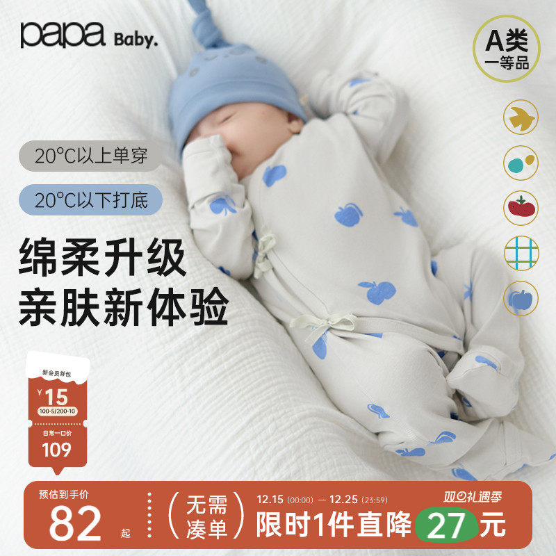 papa爬爬新生儿连体衣四季款纯棉舒适系带婴儿衣服连脚宝宝爬服