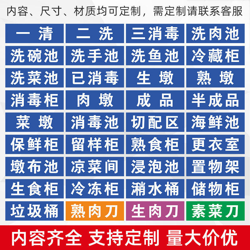 厨房各类标识贴后厨防水防油提示牌学校酒店餐饮厨房标示牌贴纸一清二洗三消毒PVC胶片贴各类菜品器具标识贴