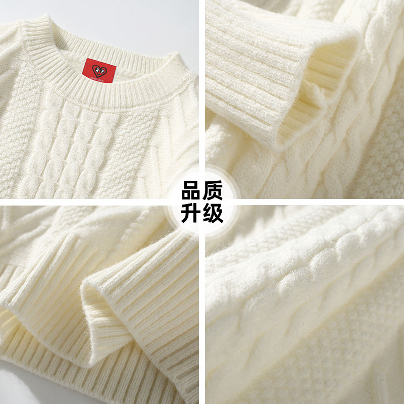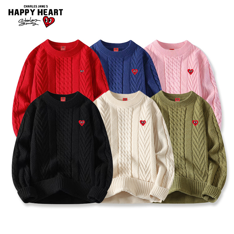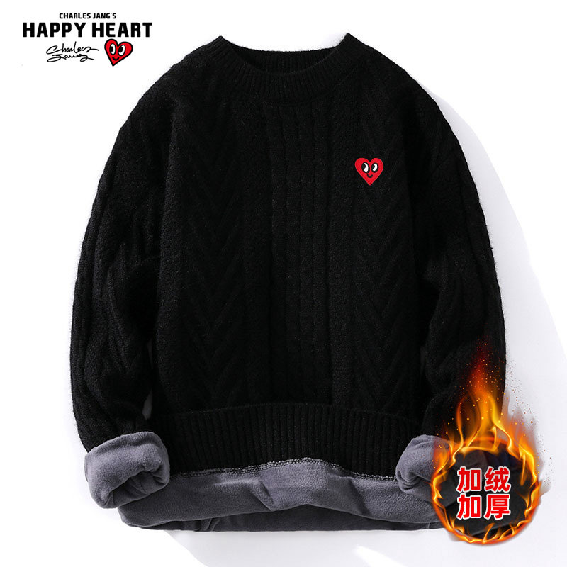 查尔斯桃心 圆领毛衣男冬季套头2025新款加绒加厚爱心打底针织衫