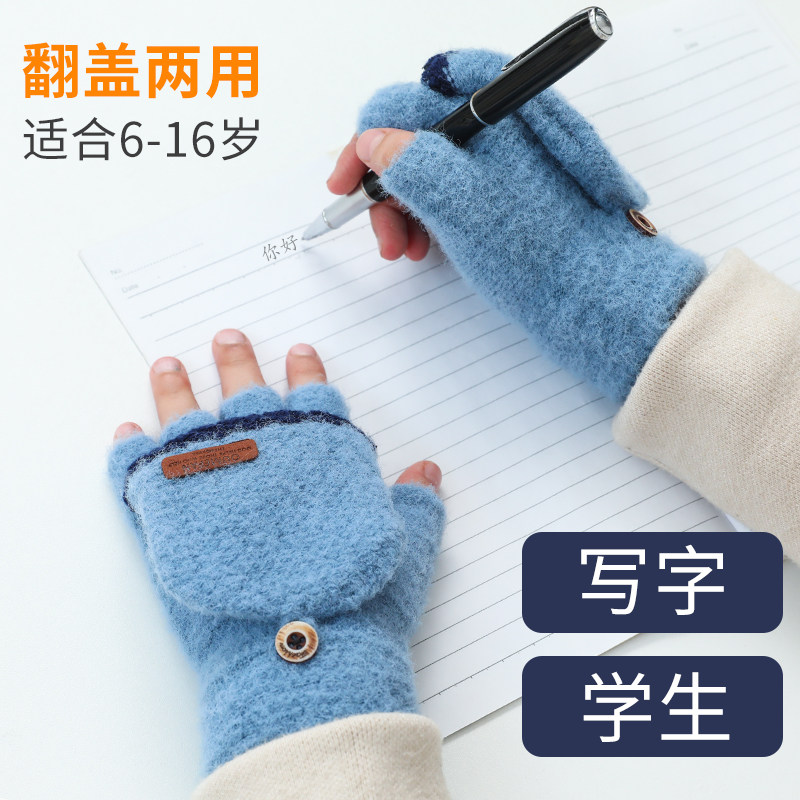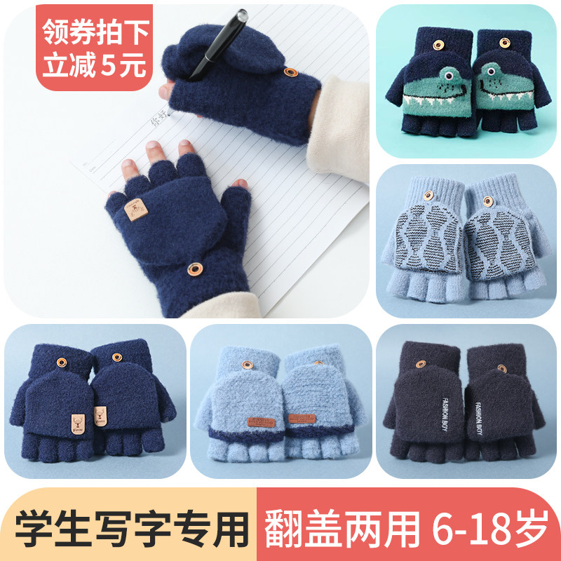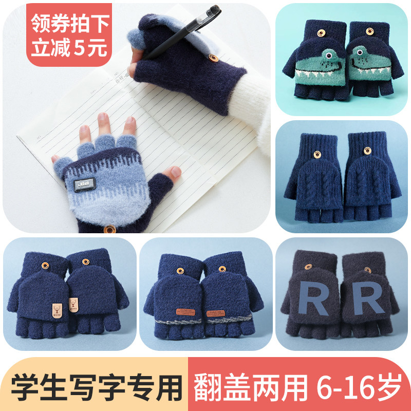 儿童手套男童秋冬季保暖写字翻盖小男孩小学生半指写作业大童冬天