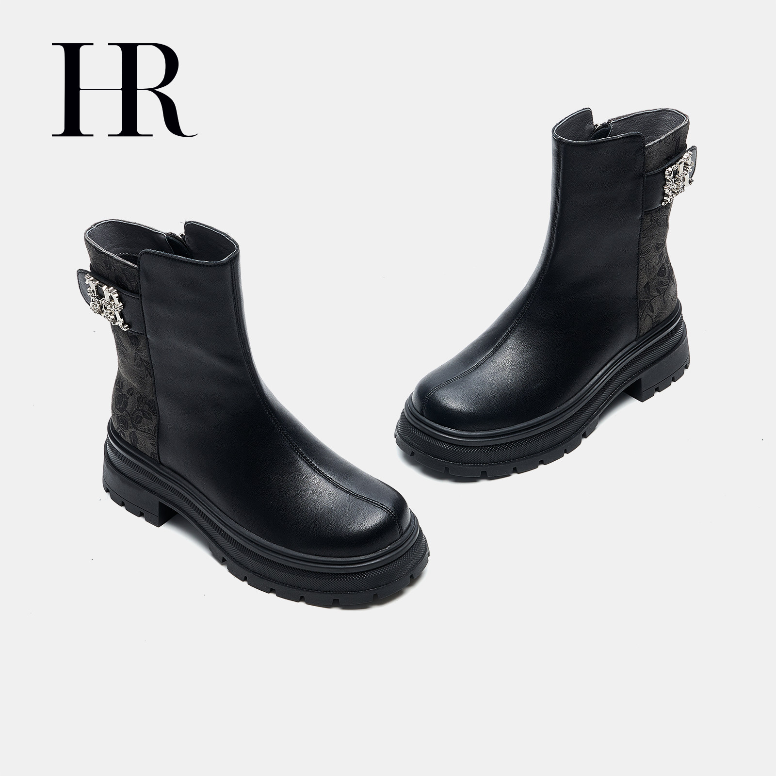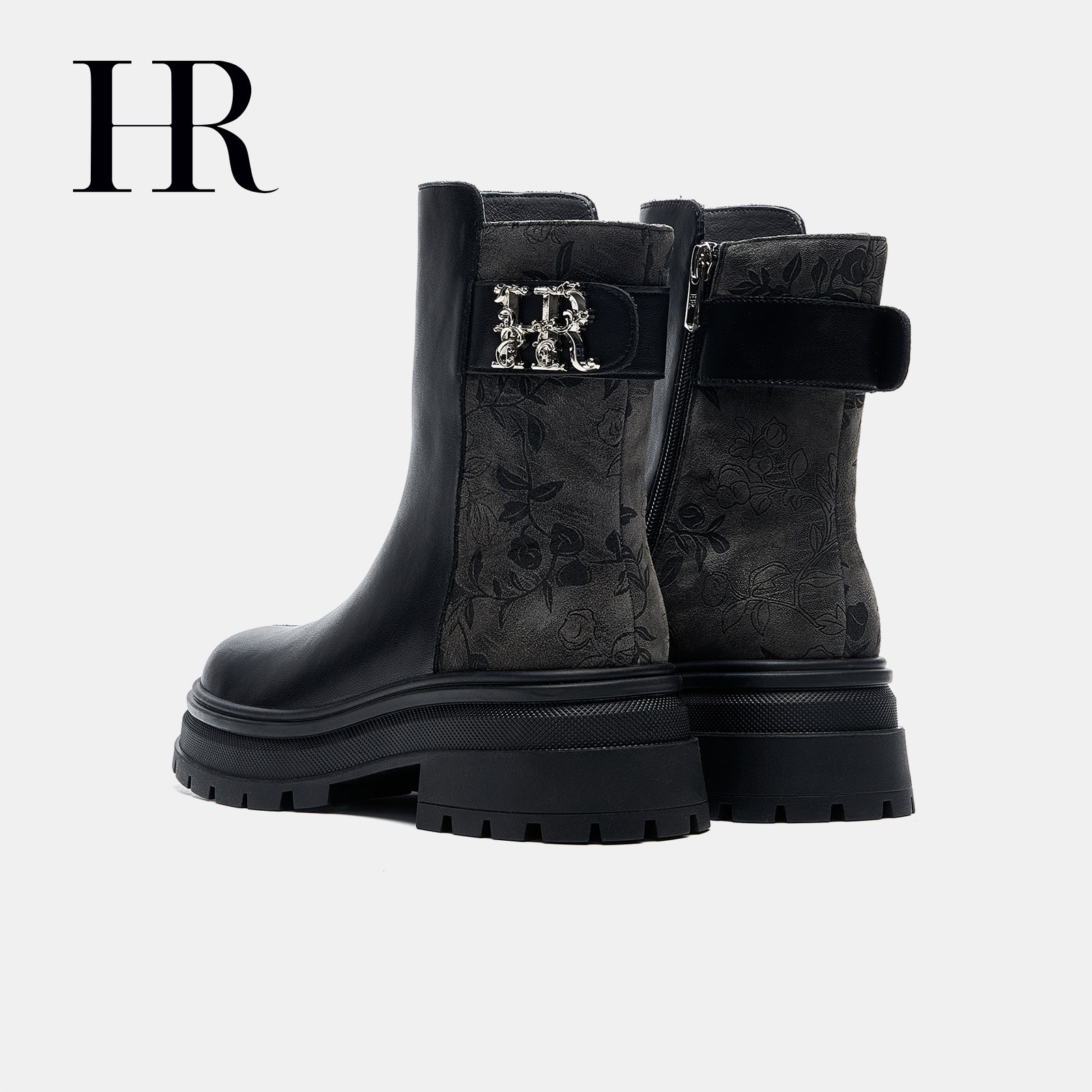 HR赫莲娜女鞋子2025冬季新款马丁靴厚底国风印花时尚百搭圆头短靴