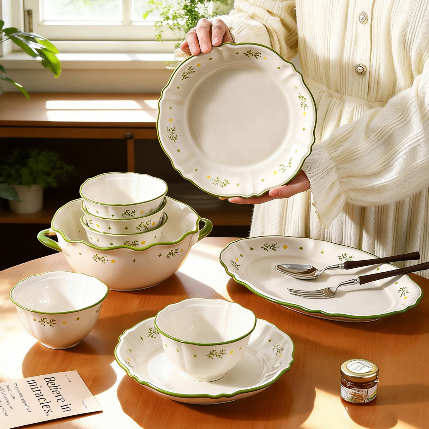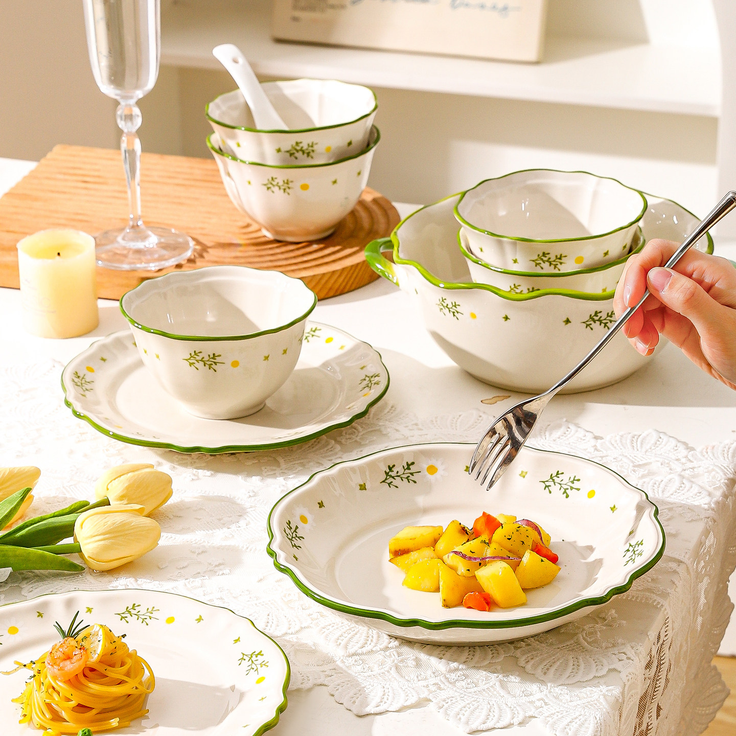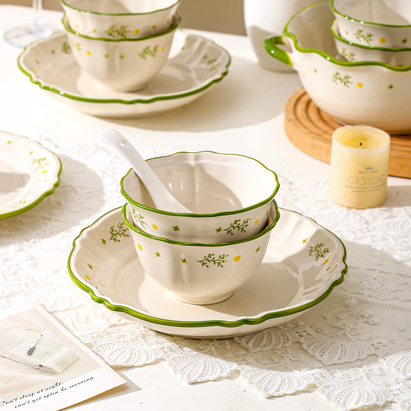 奶油风陶瓷碗家用卡通菜盘子可爱米饭碗汤碗釉下彩儿童餐具耐高温