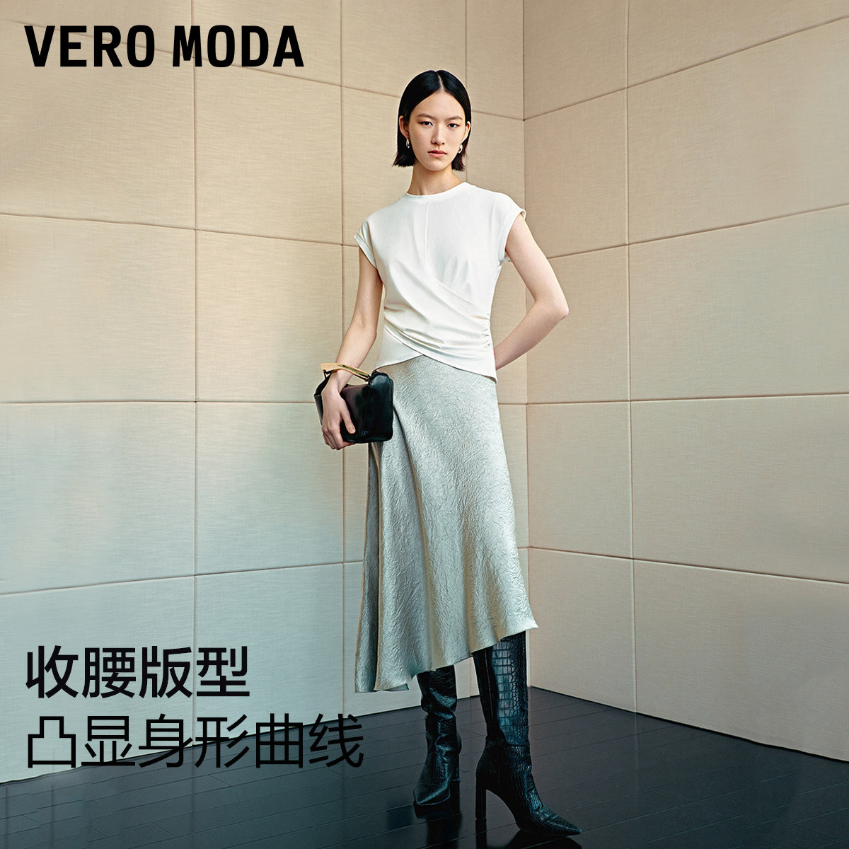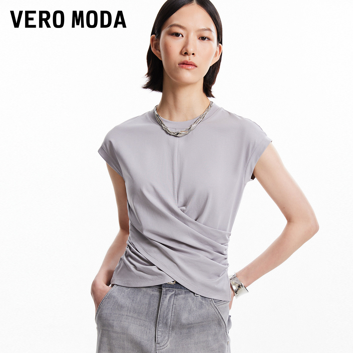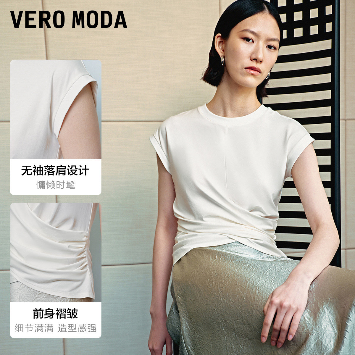 Vero Moda奥莱T恤短袖女秋冬新款褶皱落肩无袖法式简约百搭上衣