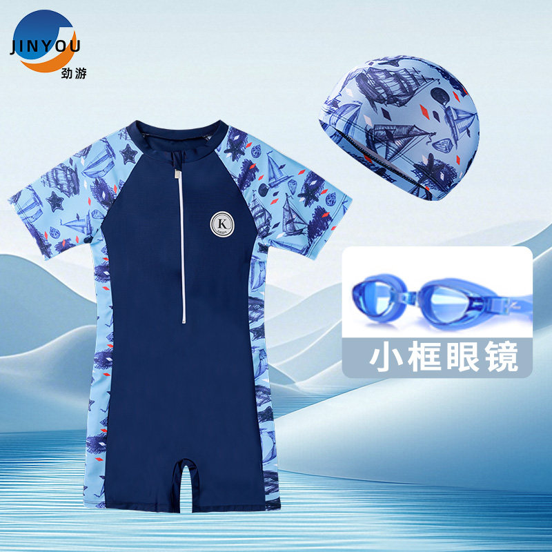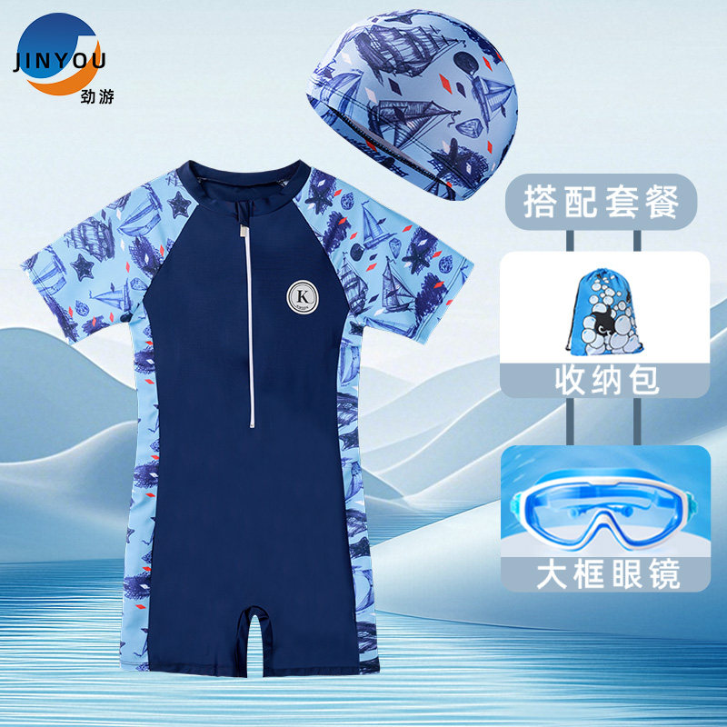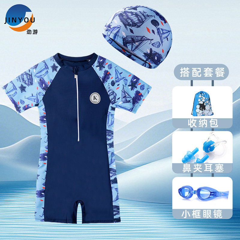 劲游儿童连体泳衣男童宝宝速干新款小中大童游泳防晒套装温泉装备