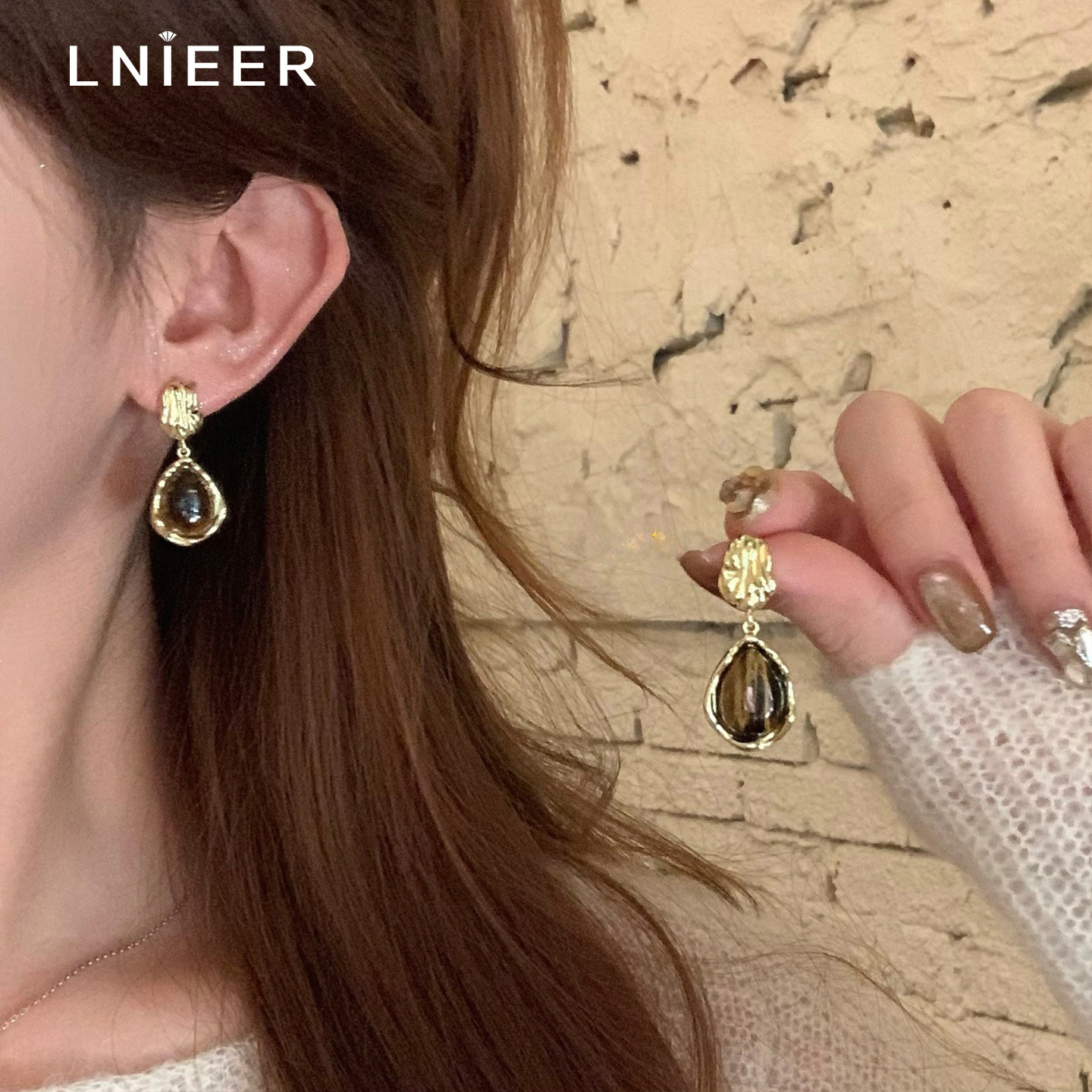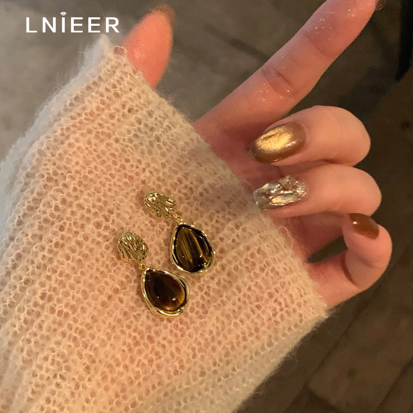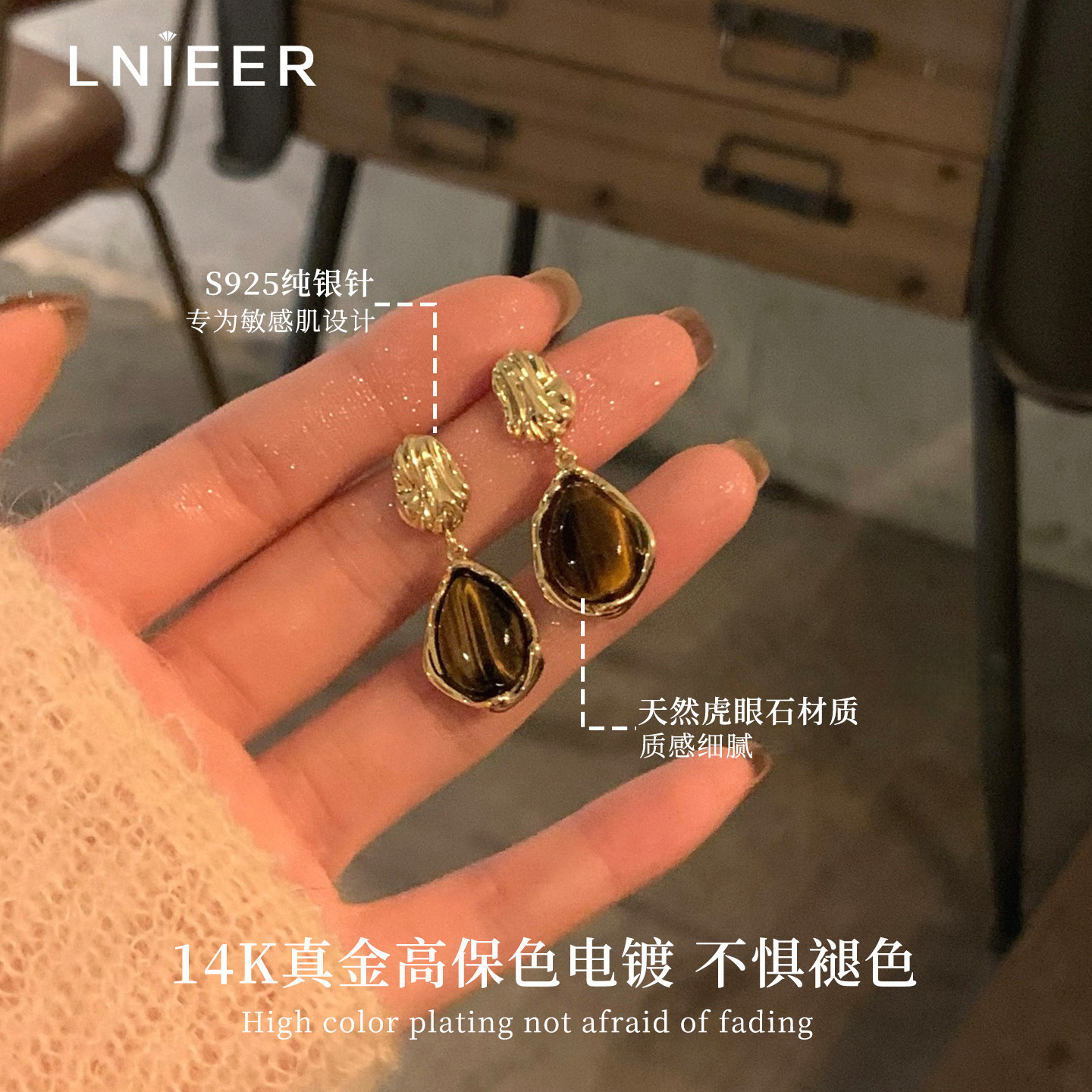 S925纯银针美拉德虎眼石水滴耳钉轻奢独特高级感耳环秋冬漂亮耳饰