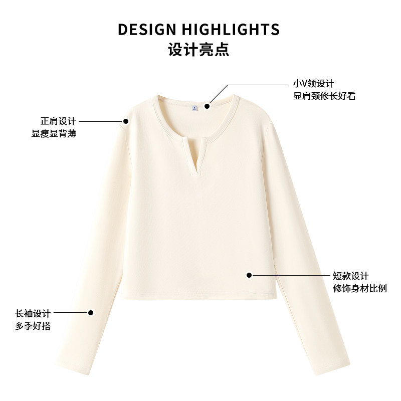 三福打底衫女2025新款秋季简约纯色收腰V领修身休闲长袖上衣女装