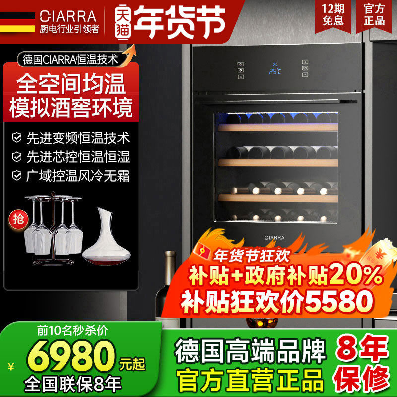 德国CIARRA嵌入式红酒柜恒温吧台内嵌式智能茶叶小客厅家用冷藏柜