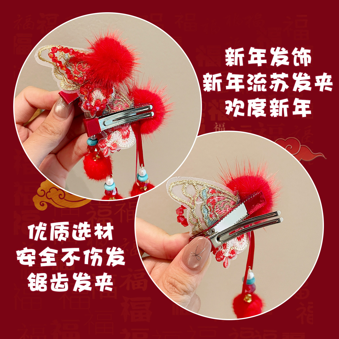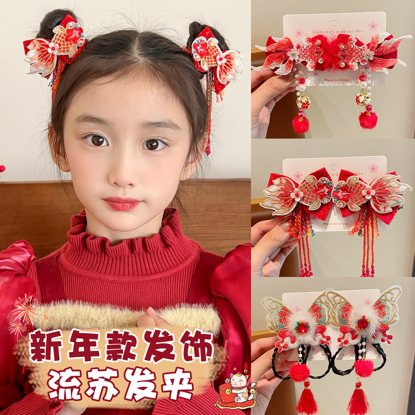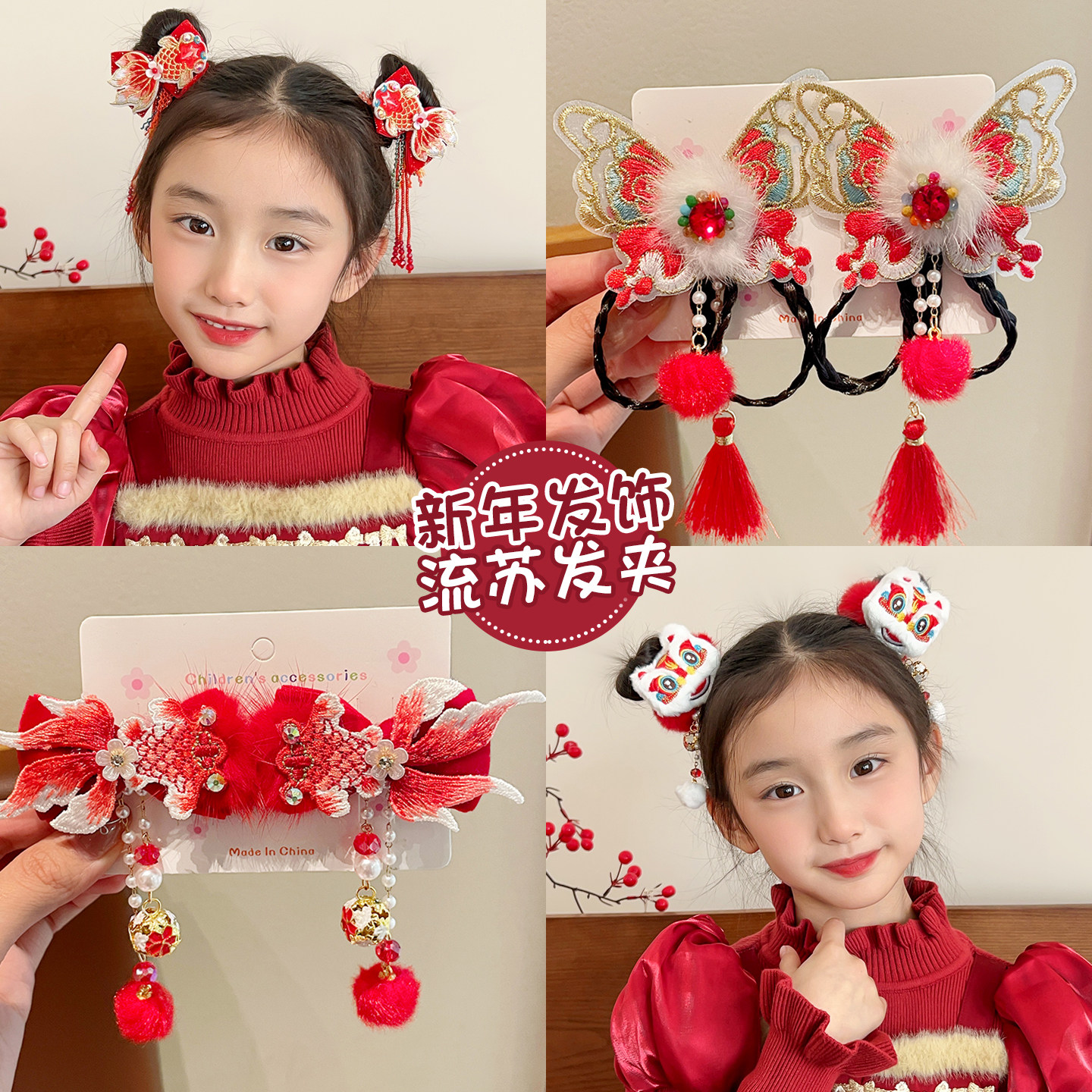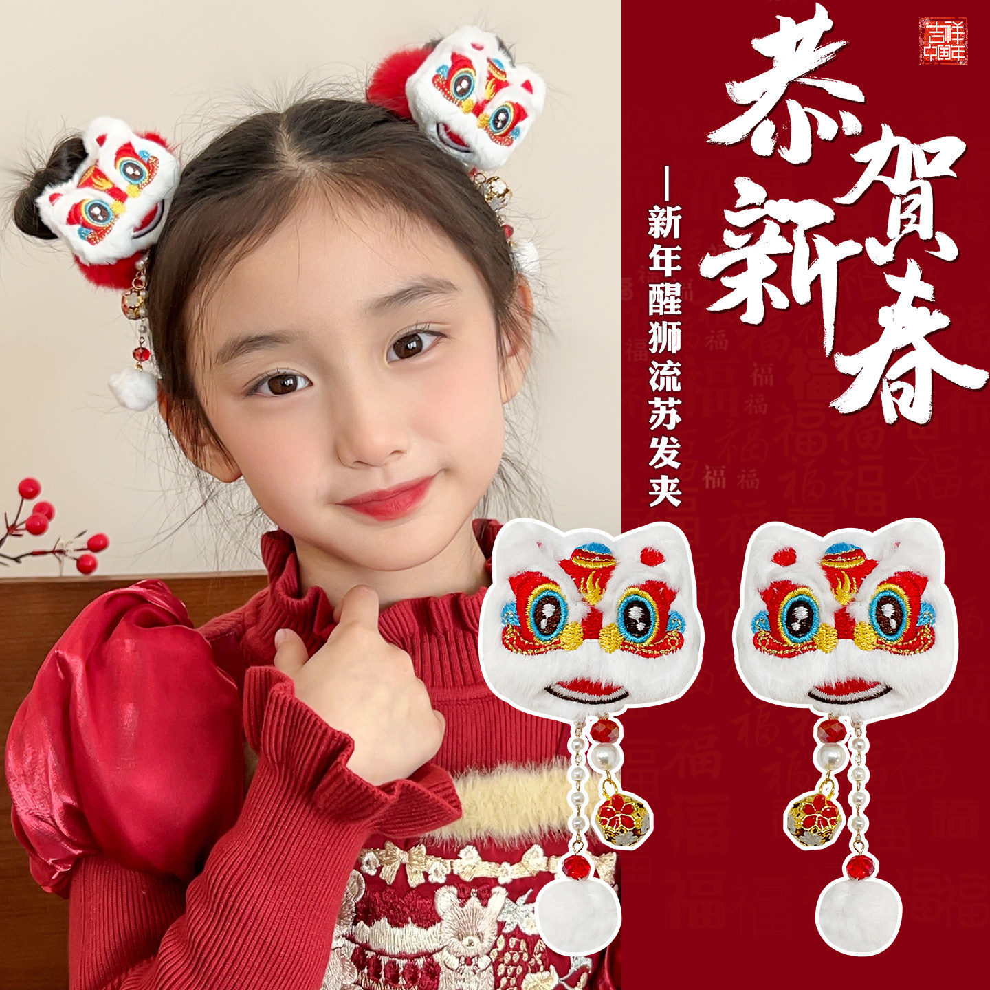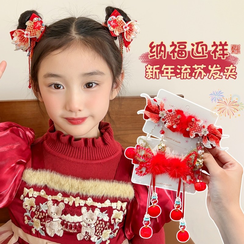 儿童新年醒狮发夹女童红色毛绒发卡宝宝喜庆铃铛发饰女孩头饰流苏