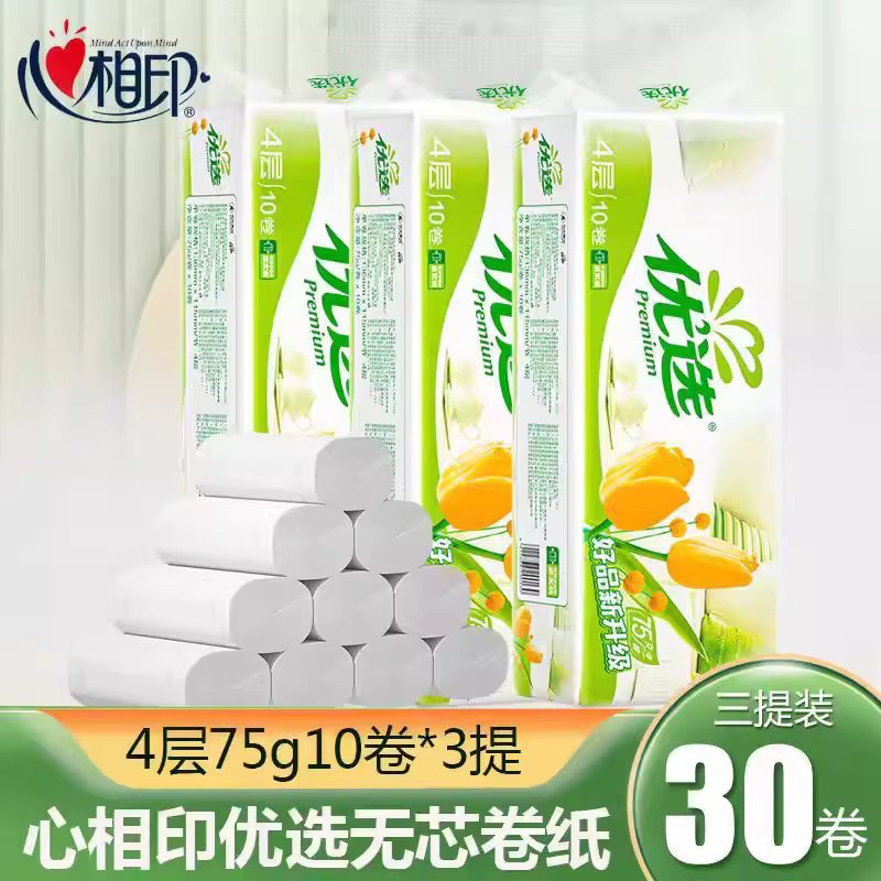 心相印卷纸4层75g30卷家用实惠装无芯卷筒纸卫生纸巾学生厕纸原生
