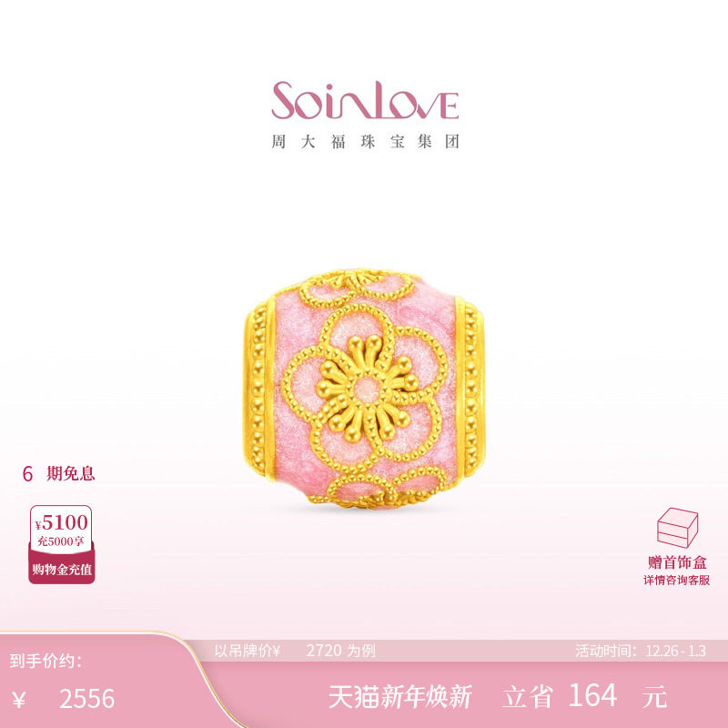 周大福SOINLOVE蜜粉金十里红妆粉彩桃花黄金转运珠配绳圣诞礼物
