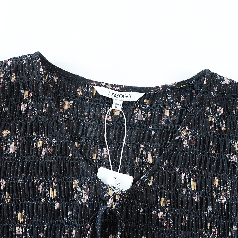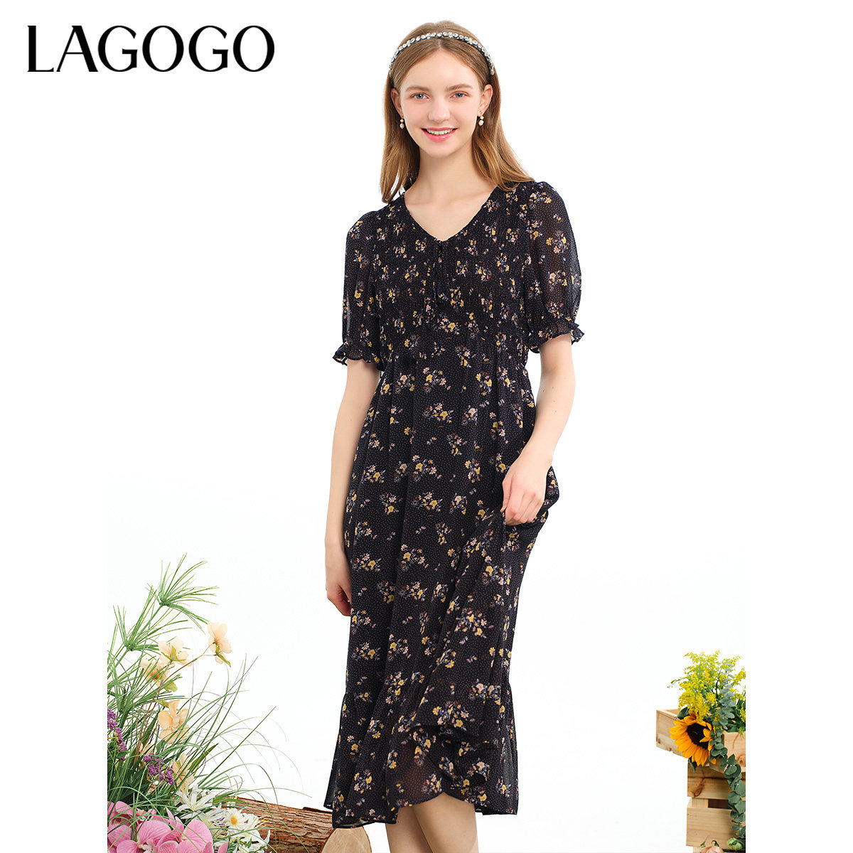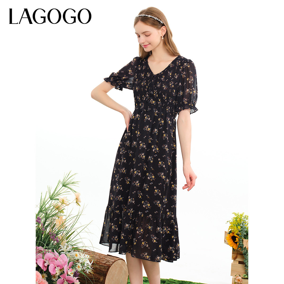 LAGOGO法式波点碎花连衣裙女拉谷谷夏季新款气质V领雪纺A字中长裙