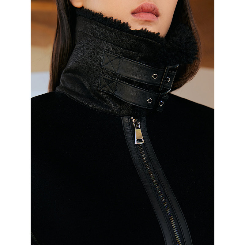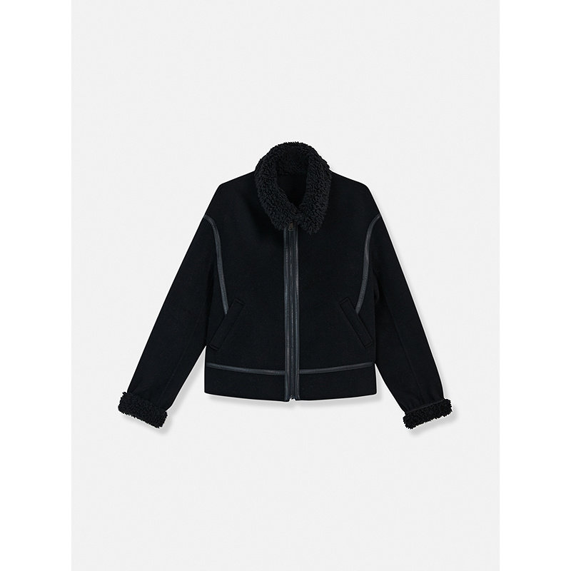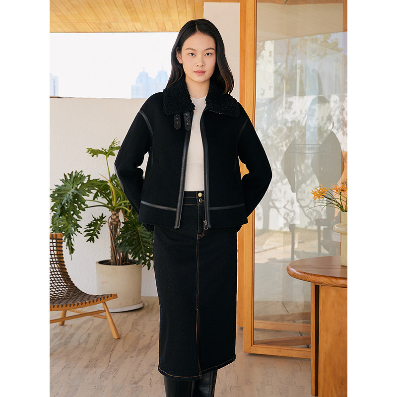 YINER音儿专选女装冬季时尚短款皮革拼接翻领羊毛双面呢外套