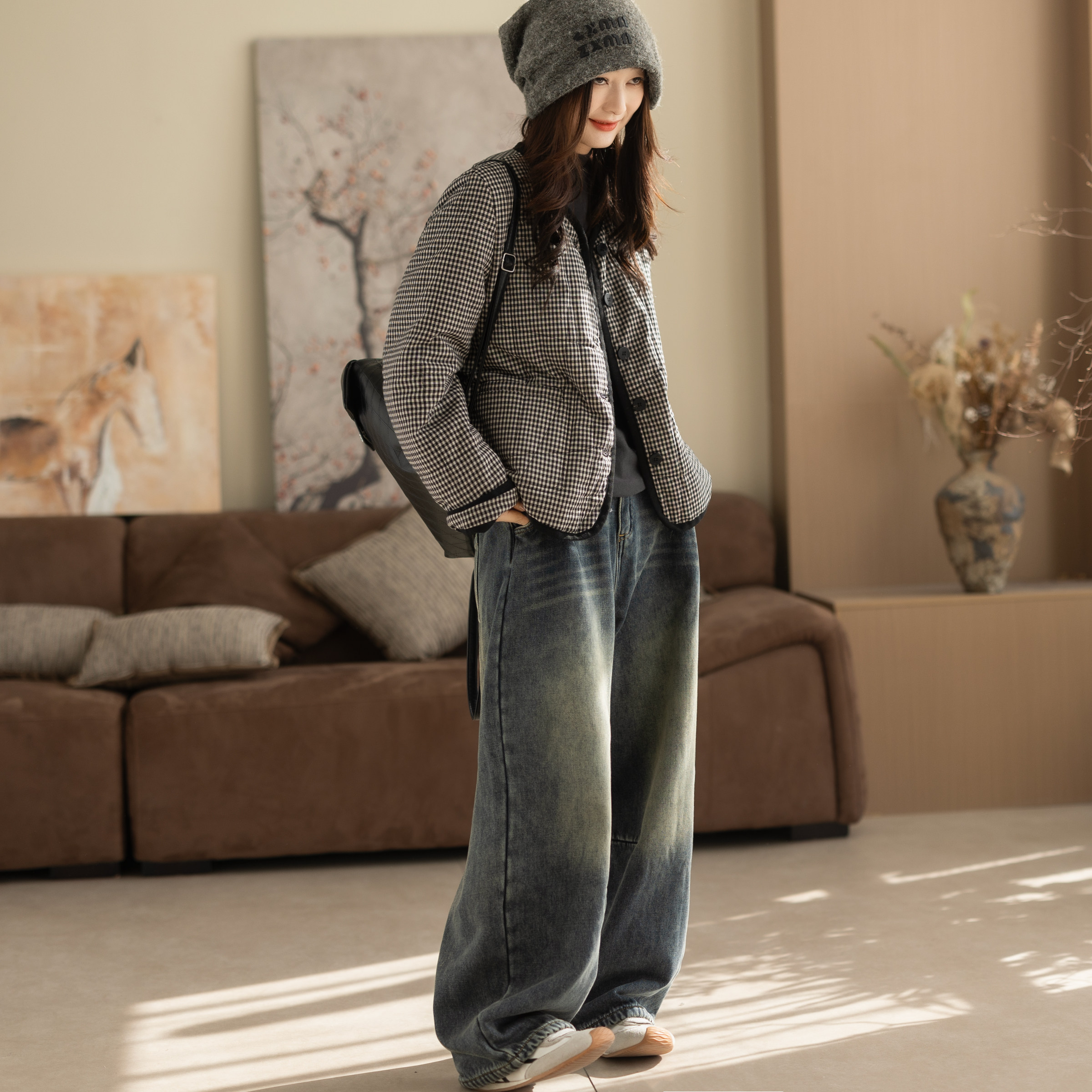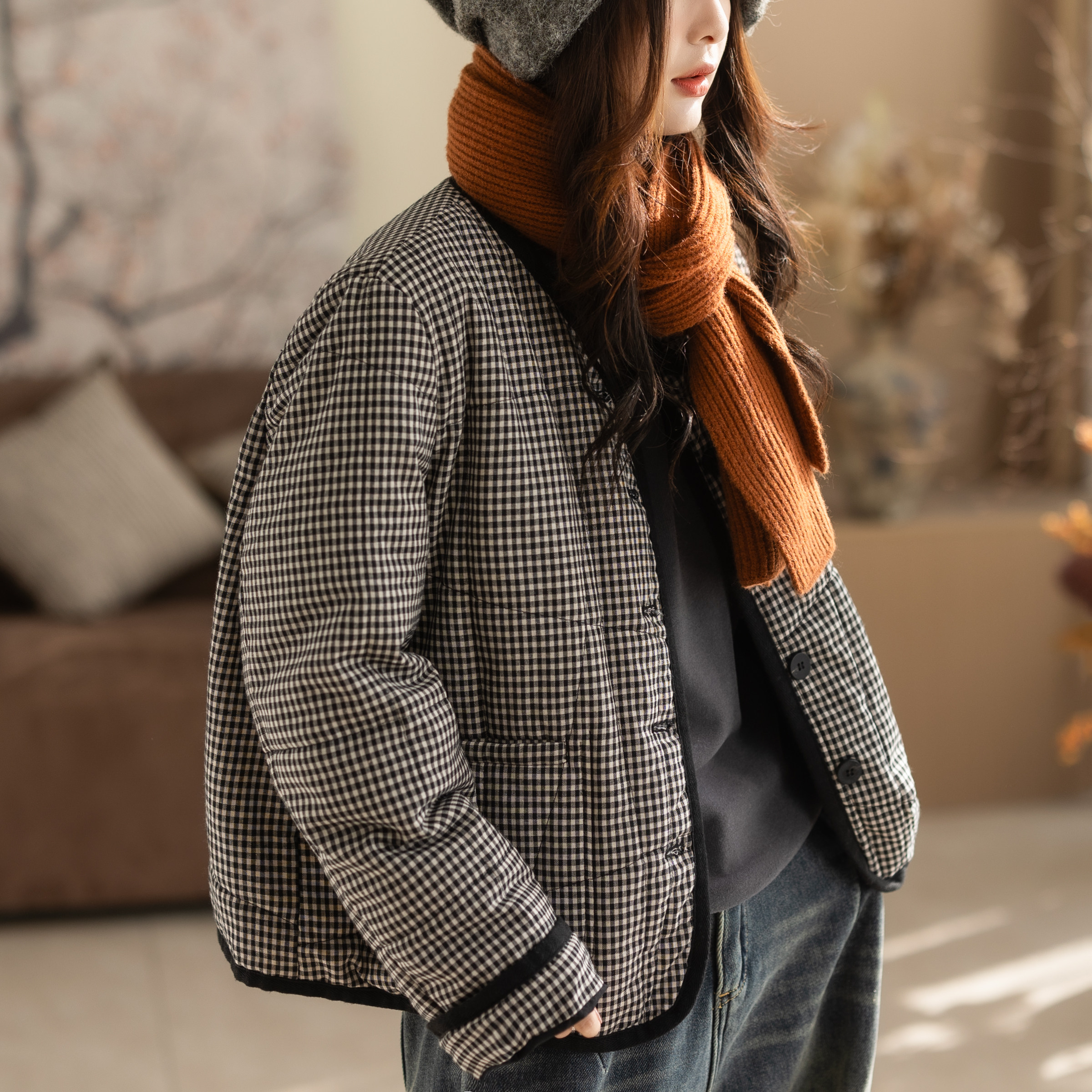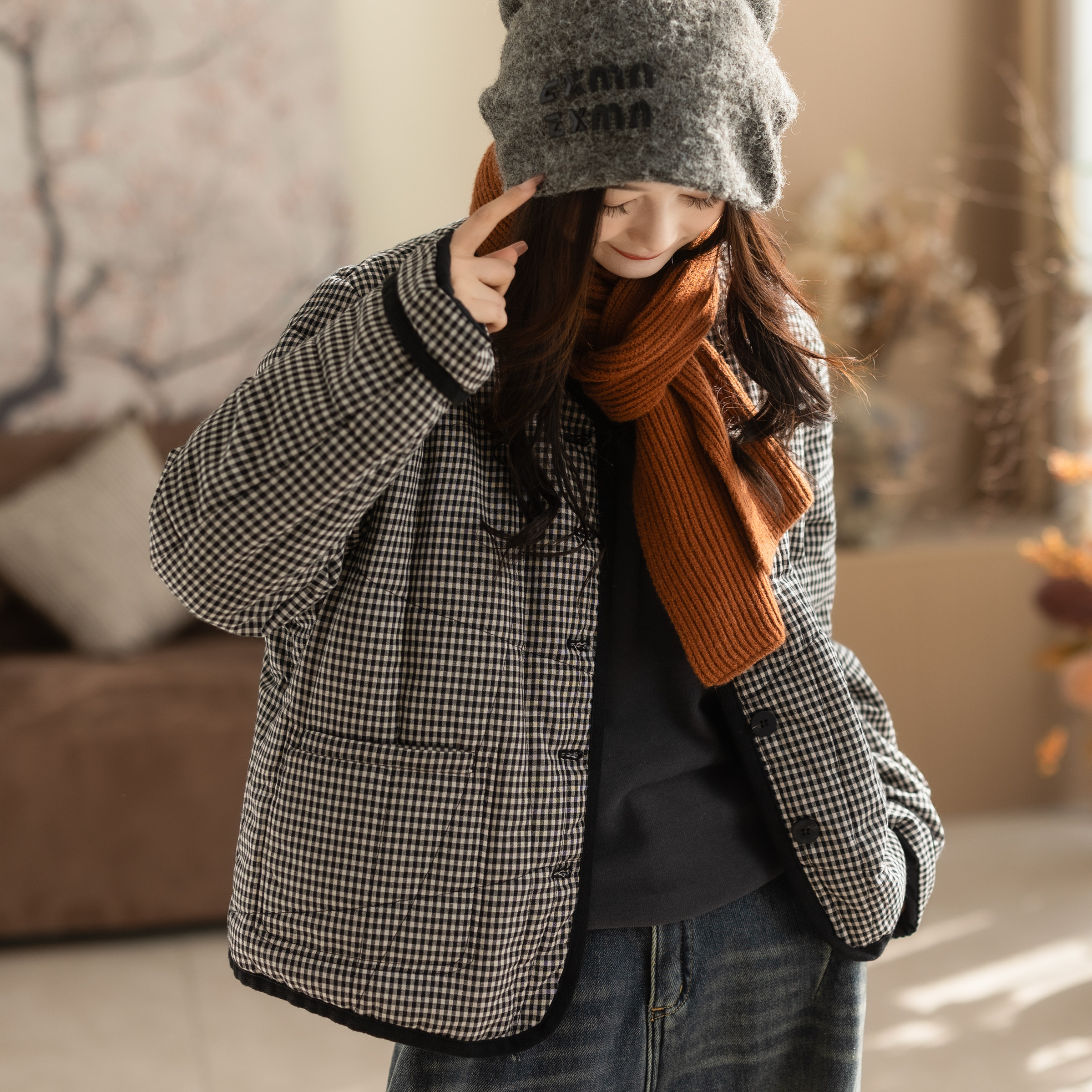 咖咪羽棉服女冬装新款格子文艺休闲女士宽松夹棉流行复古女装棉袄