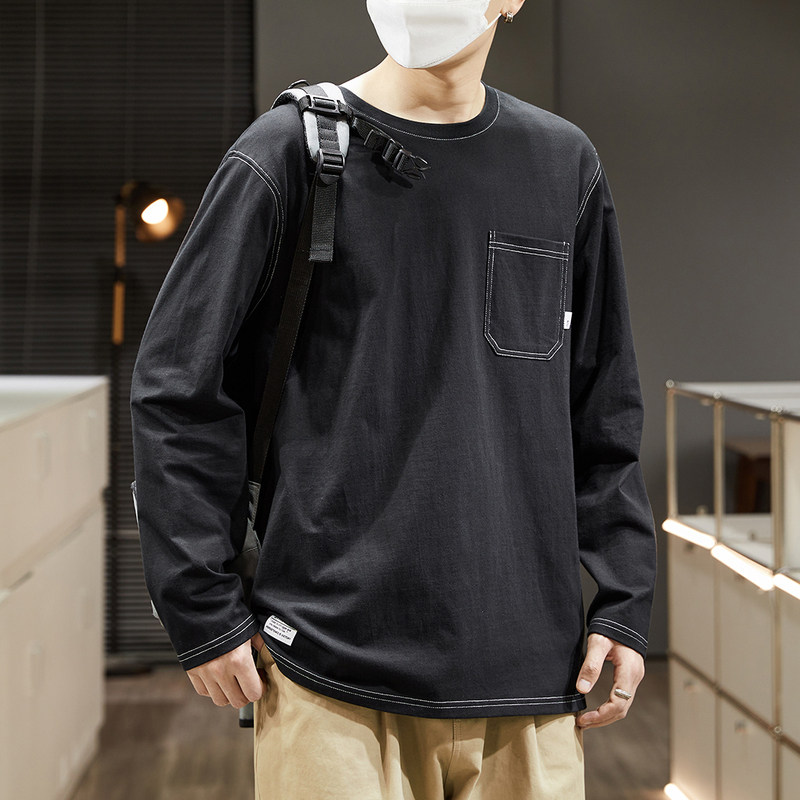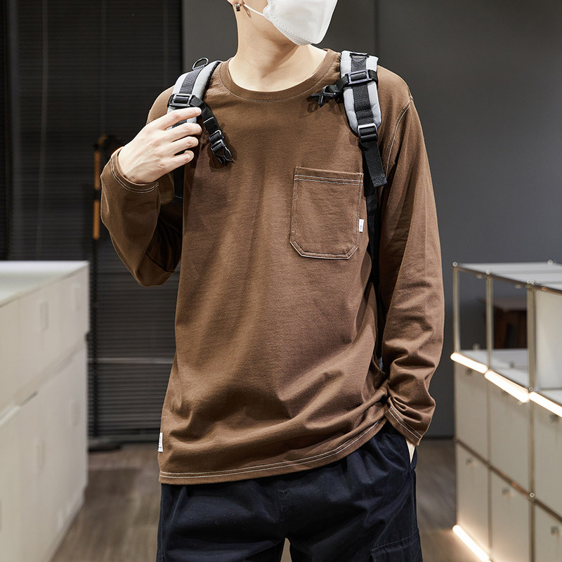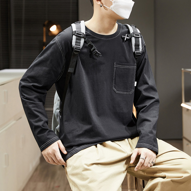 唐狮口袋长袖t恤男士春秋宽松纯棉潮打底衫圆领青春休闲流行上衣