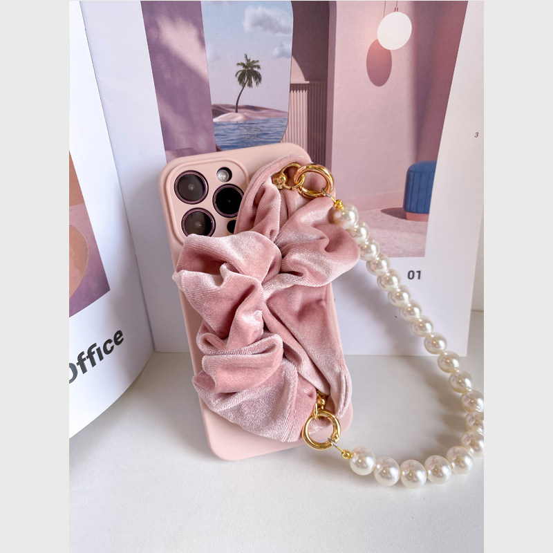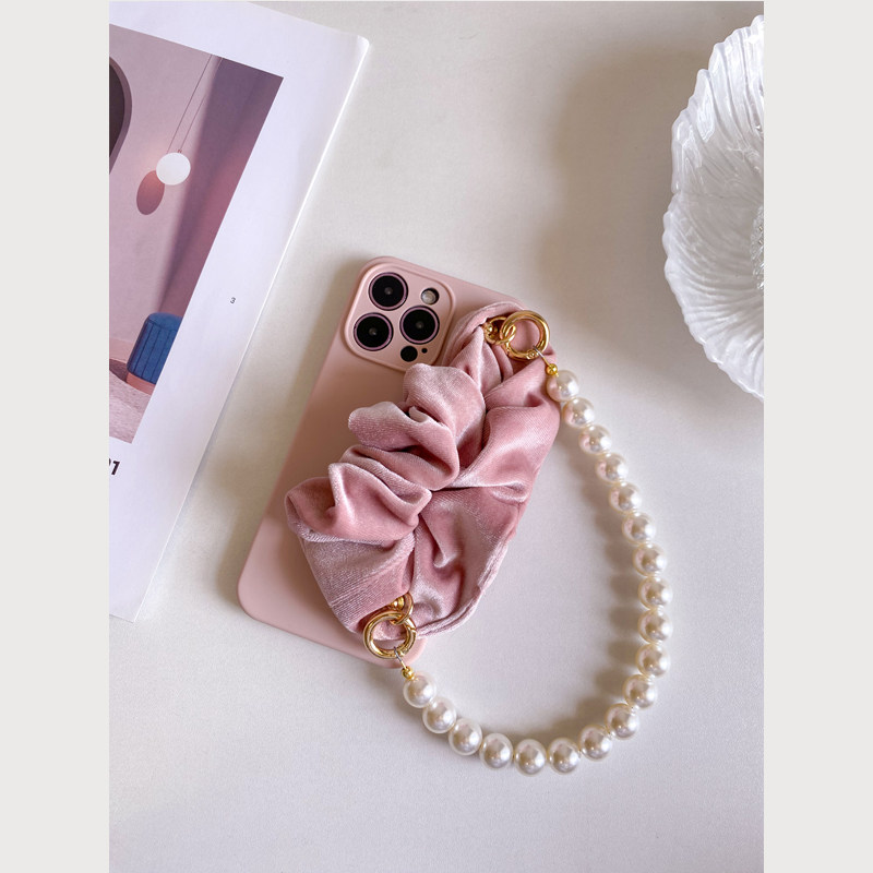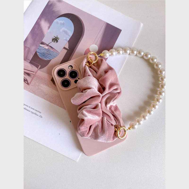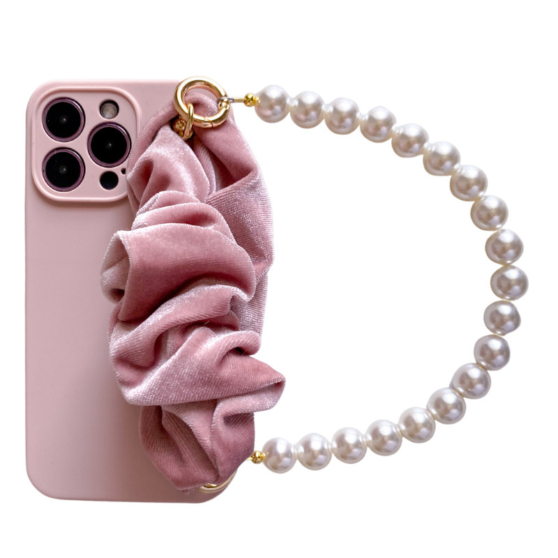 秋冬粉色优雅丝绒珍珠手链链条手机壳适用于苹果14promax防摔全包软壳iphone13系列简约个性高级感小众款苹果
