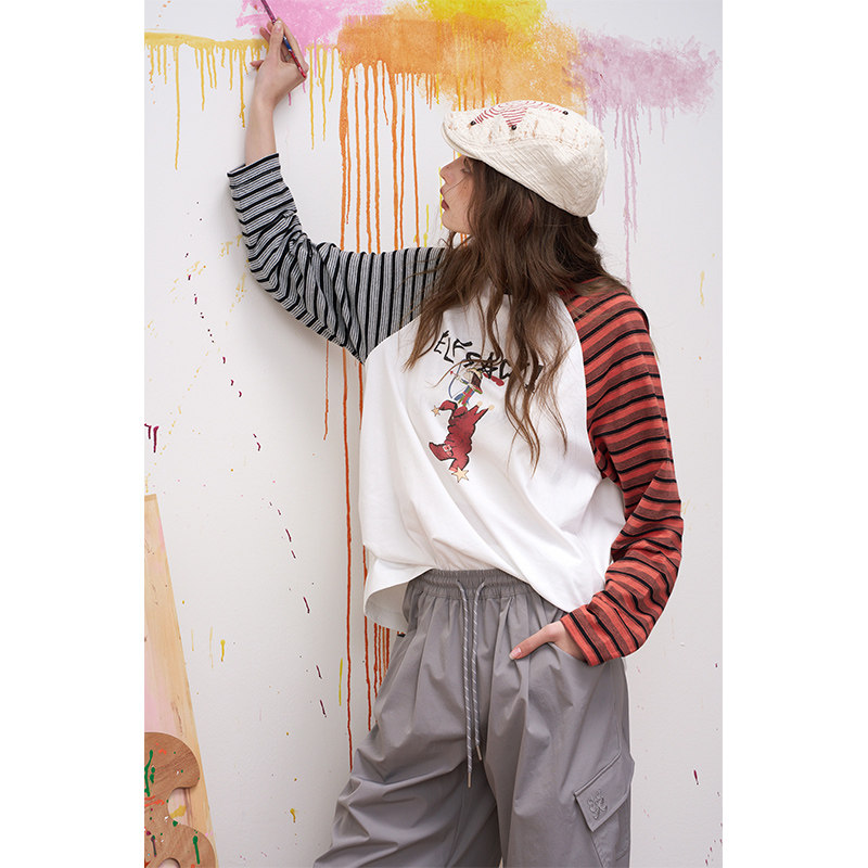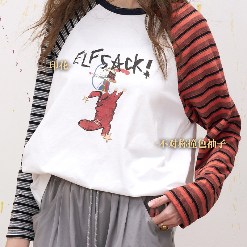 妖精的口袋条纹插肩印花长袖t恤女2026年夏季新款宽松设计感上衣