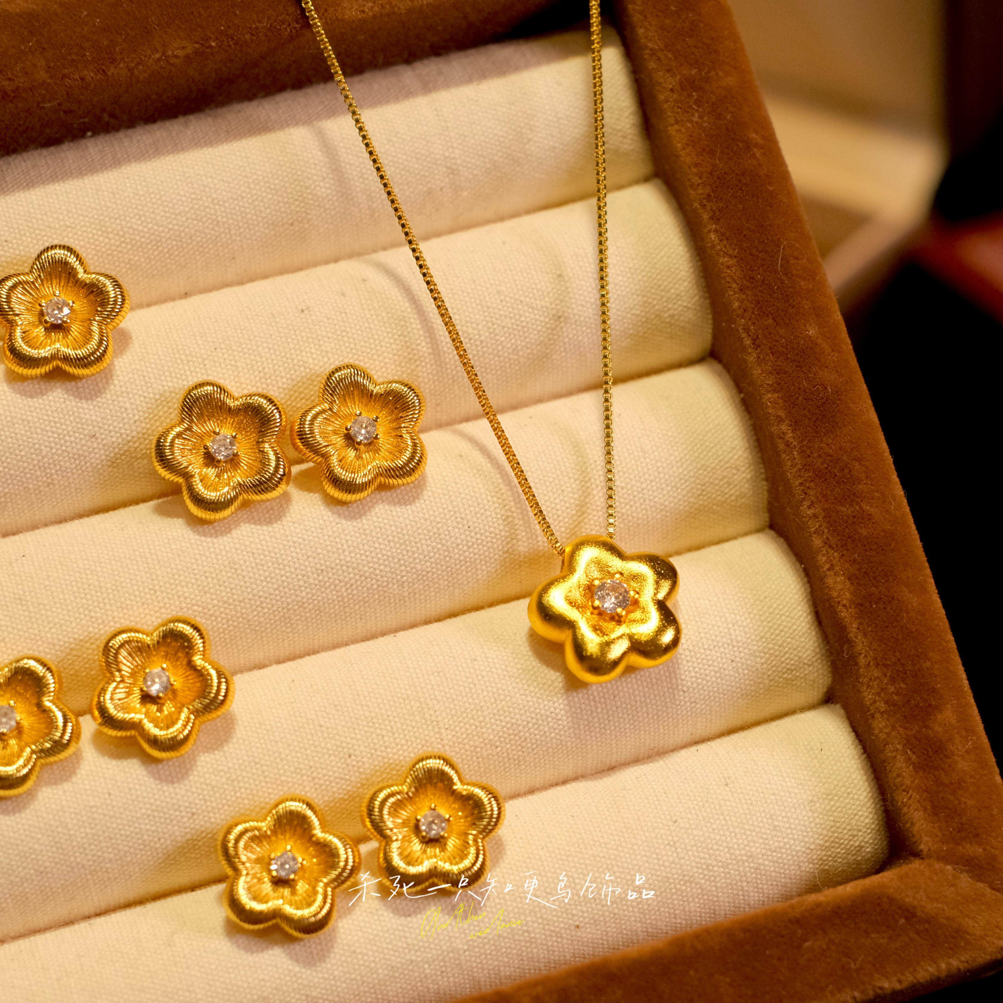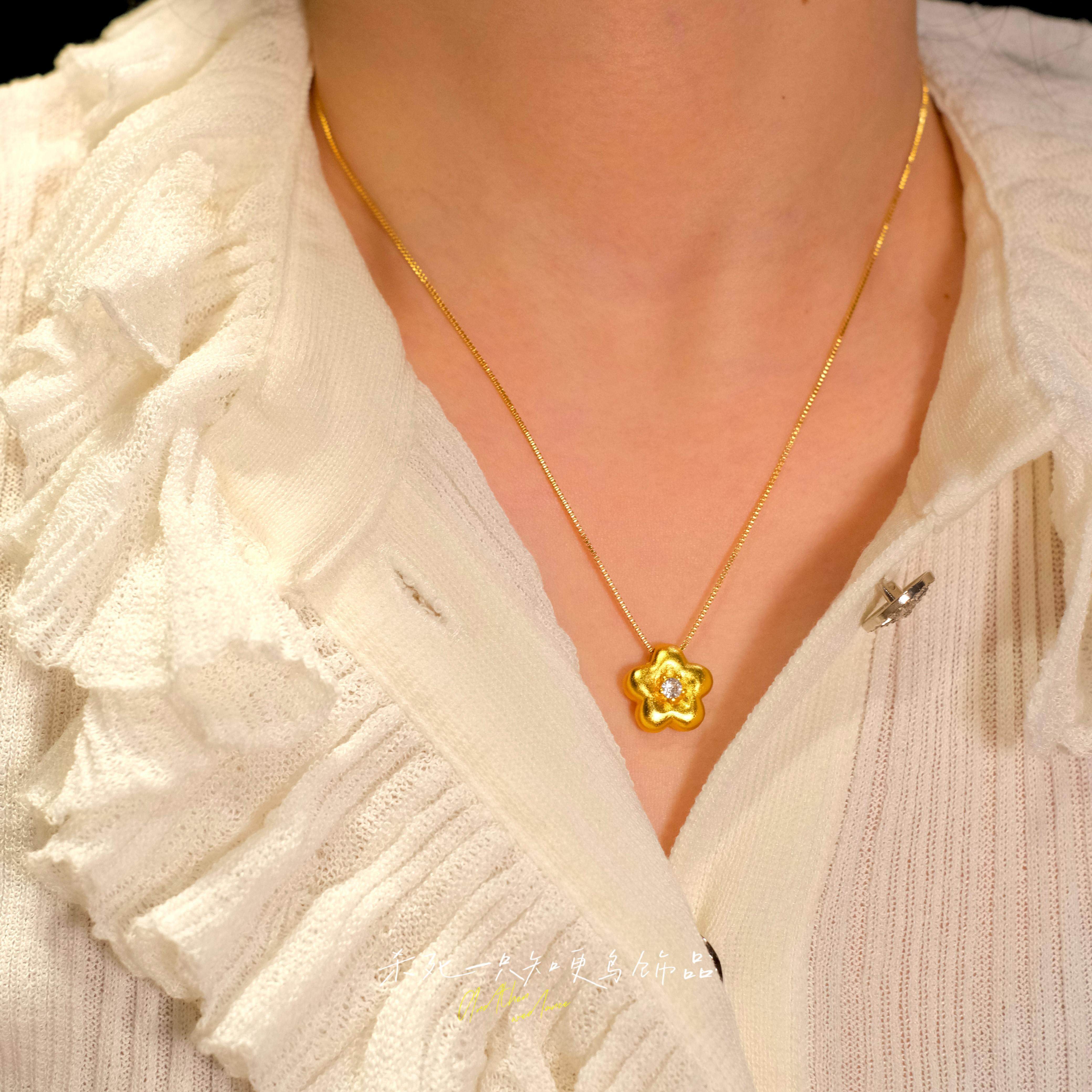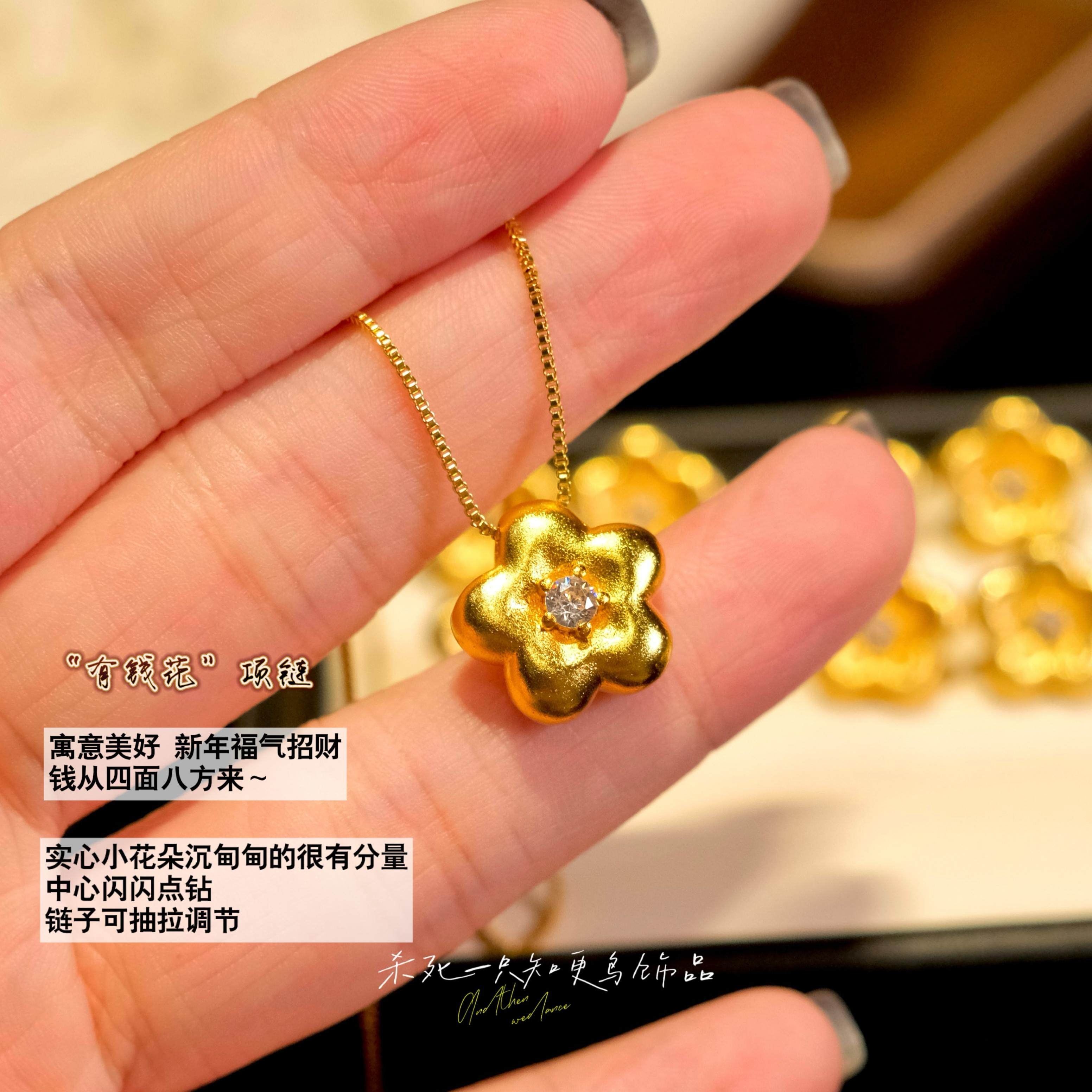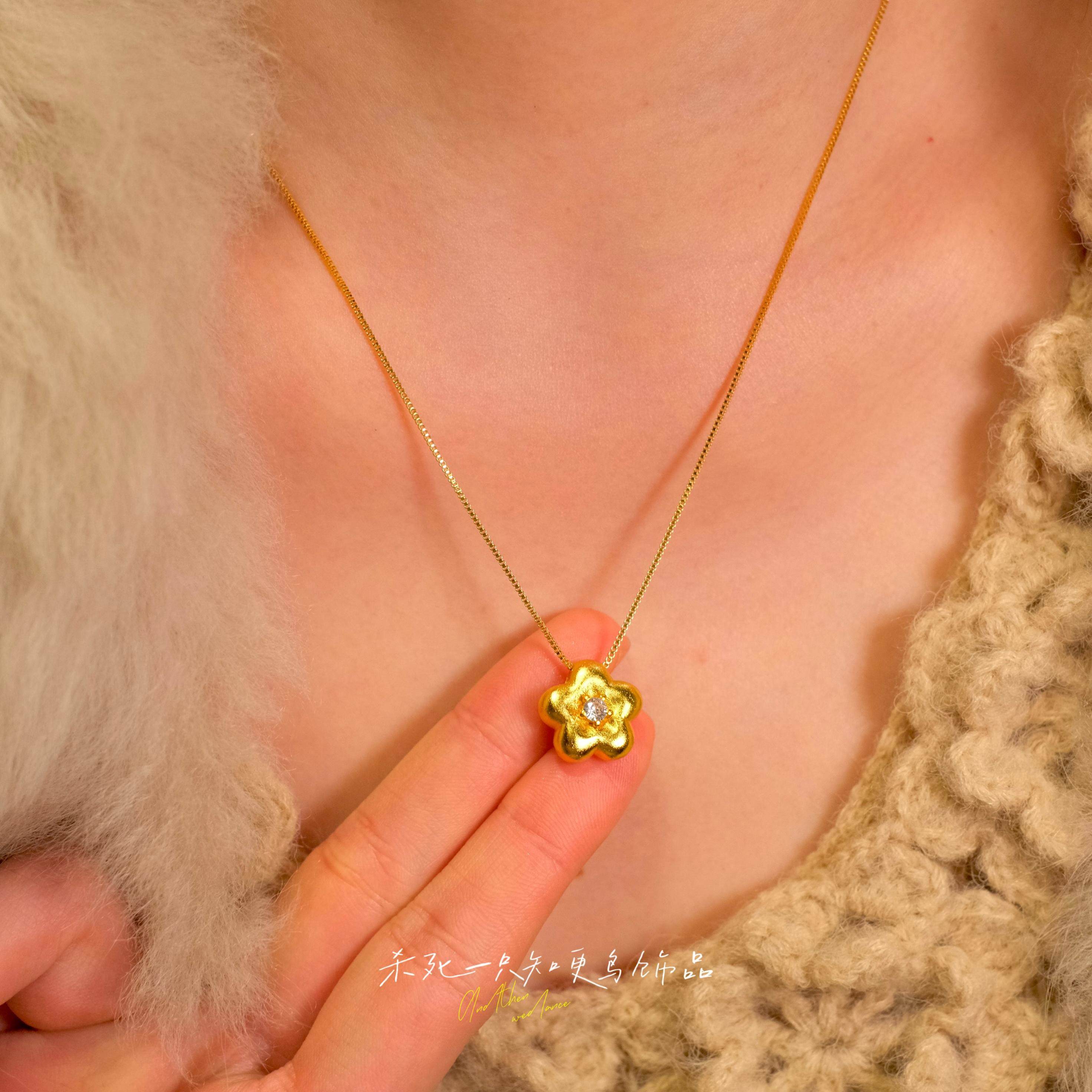 《有钱花》金店同款轻奢古法沙金实心点钻磨砂小金花吊坠毛衣项链