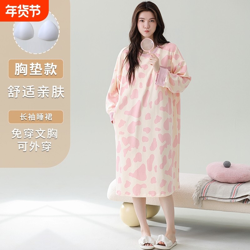 2025秋冬新款带胸垫睡裙长袖高级感圆领套头中长款可外穿睡衣裙
