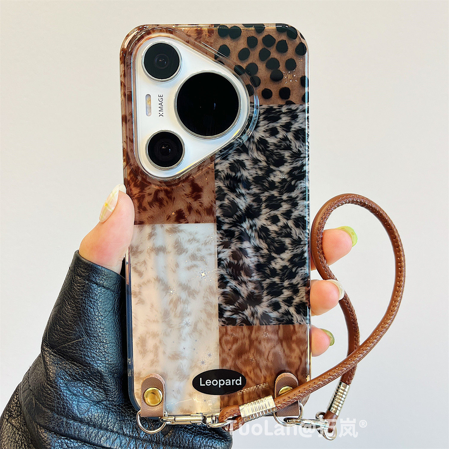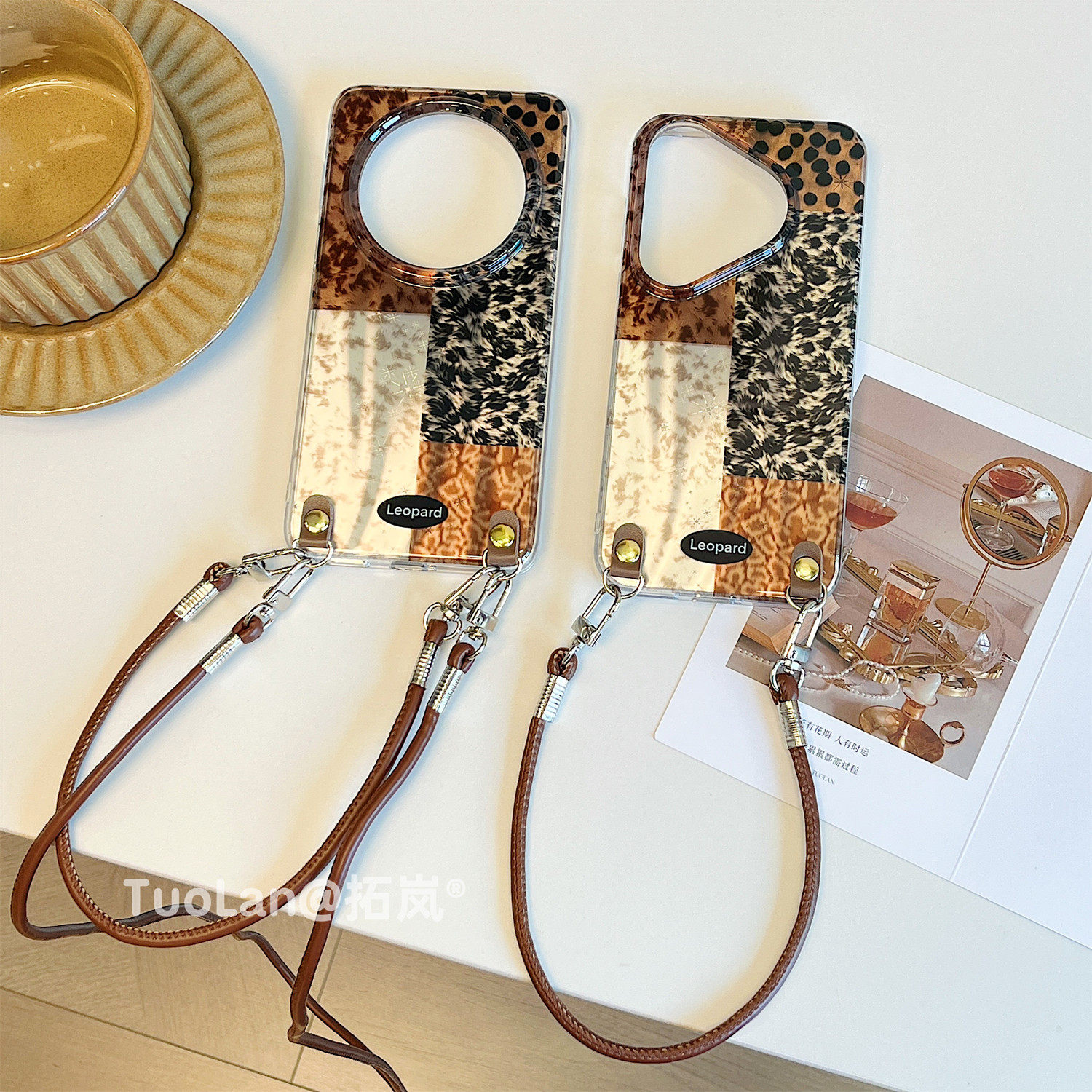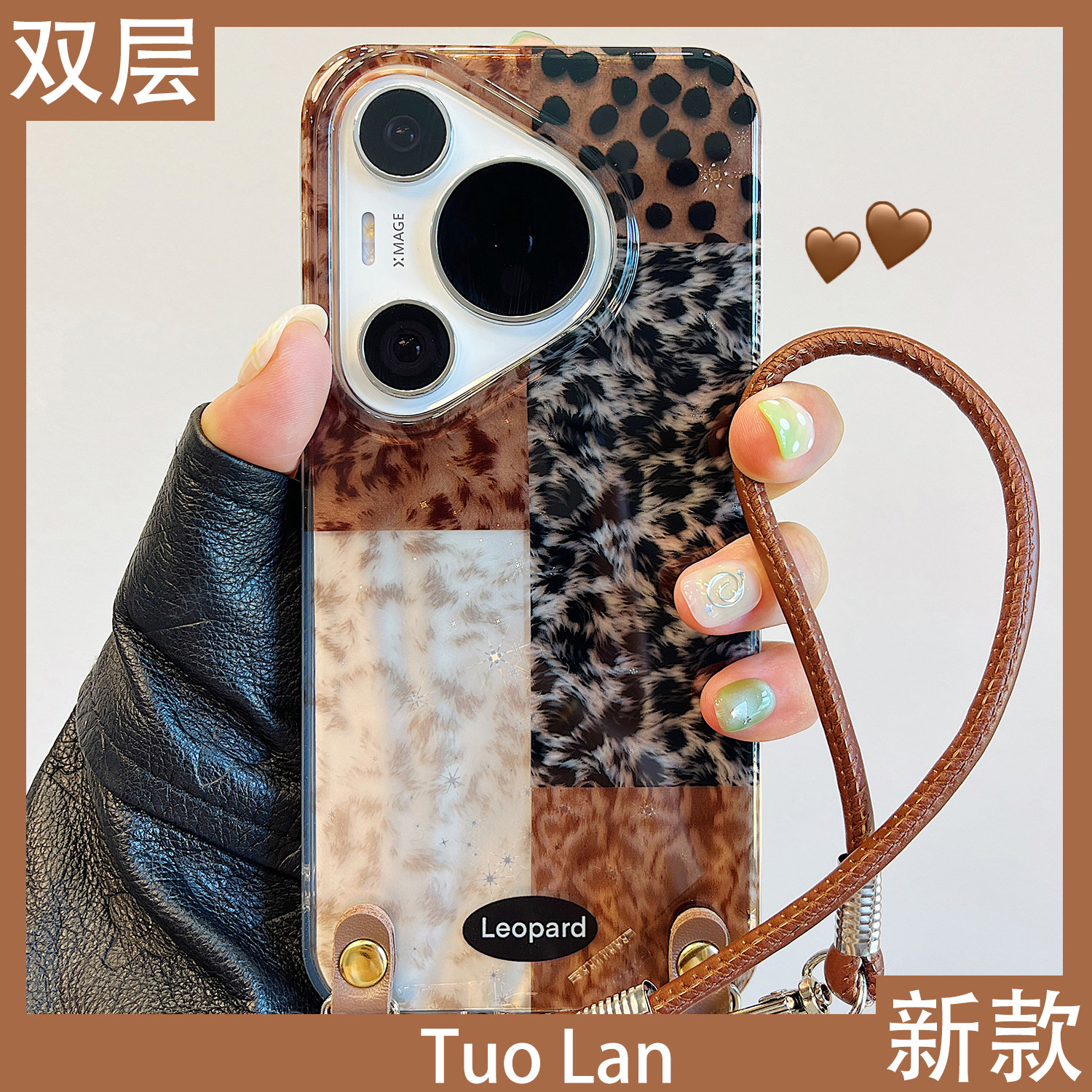 拓岚 适用华为pura70pro+斜跨手机壳双层Pura80pro秋冬复古拼接格纹豹纹高级感挂绳背带mate70/60pro硅胶女潮