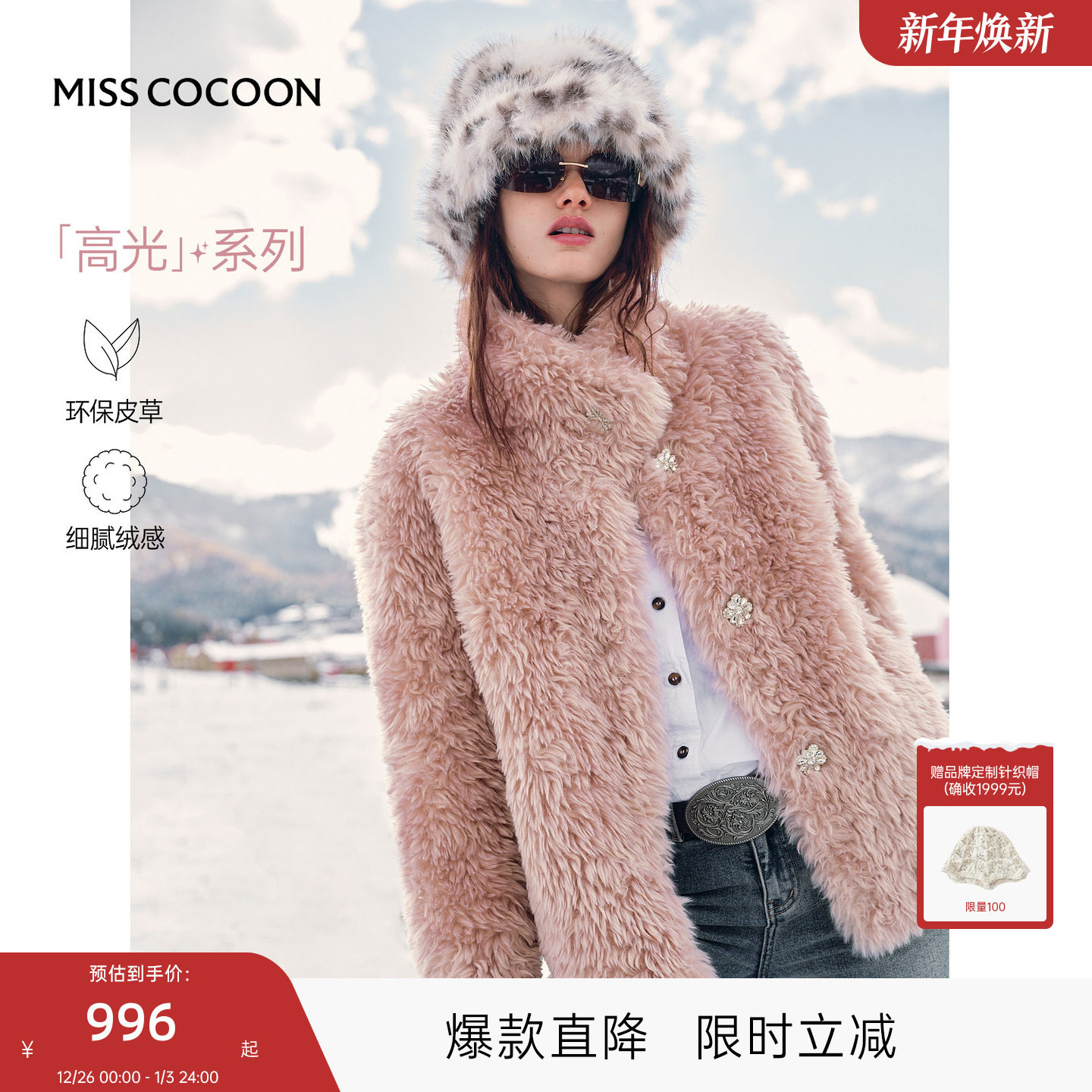 MISSCOCOON可可尼短款外套女2025冬季新款温柔风翻领粉色环保皮草