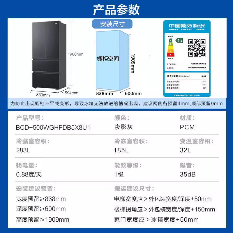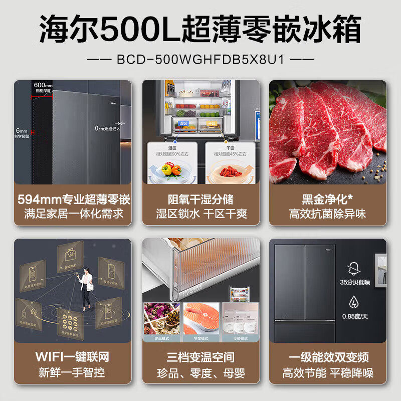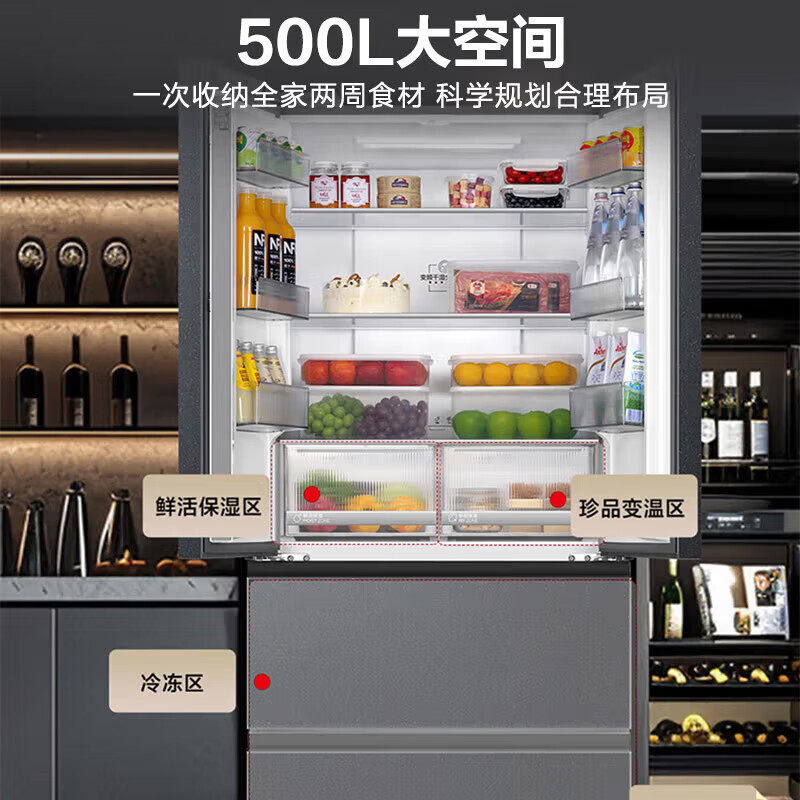海尔冰箱500升超薄零嵌入式 法式多门家用大容量变频无霜一级能效