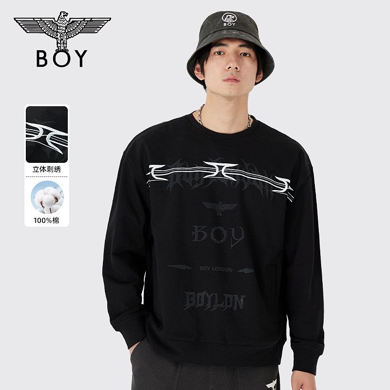 BOYLONDON春季潮男女同款印花刺绣圆领套头黑色长袖卫衣