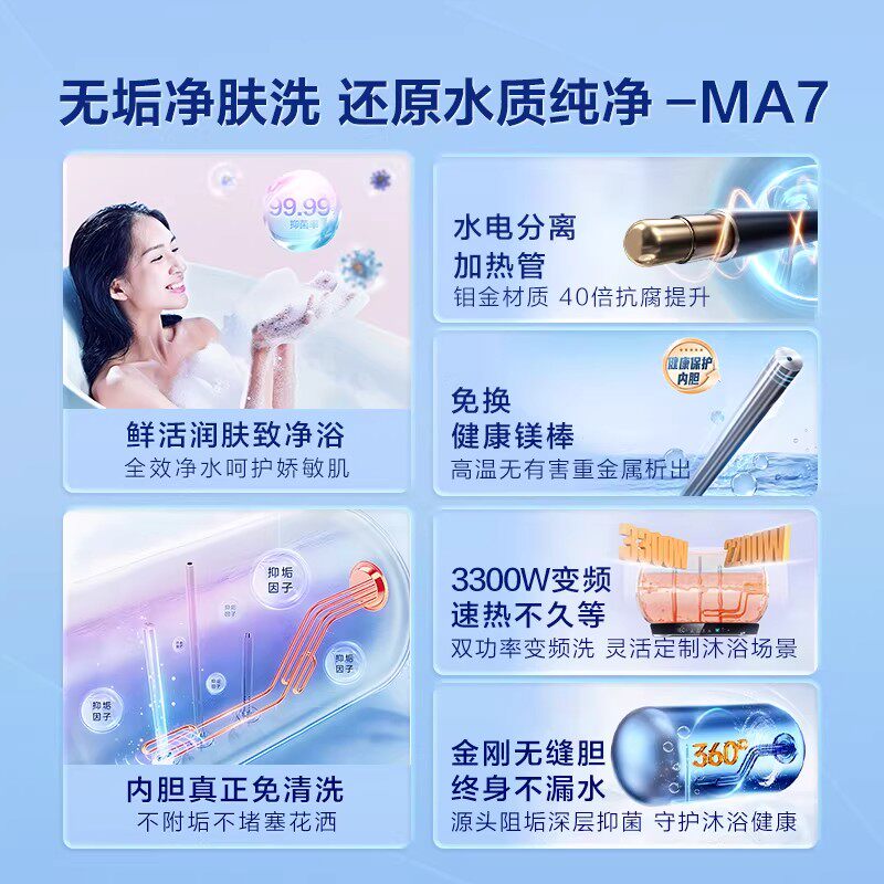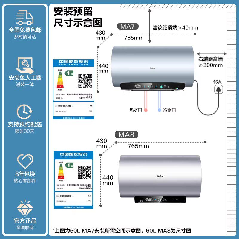 Haier/海尔EC6002-MA7U1 60升一级速热电热水器内胆免清洗80升MA7