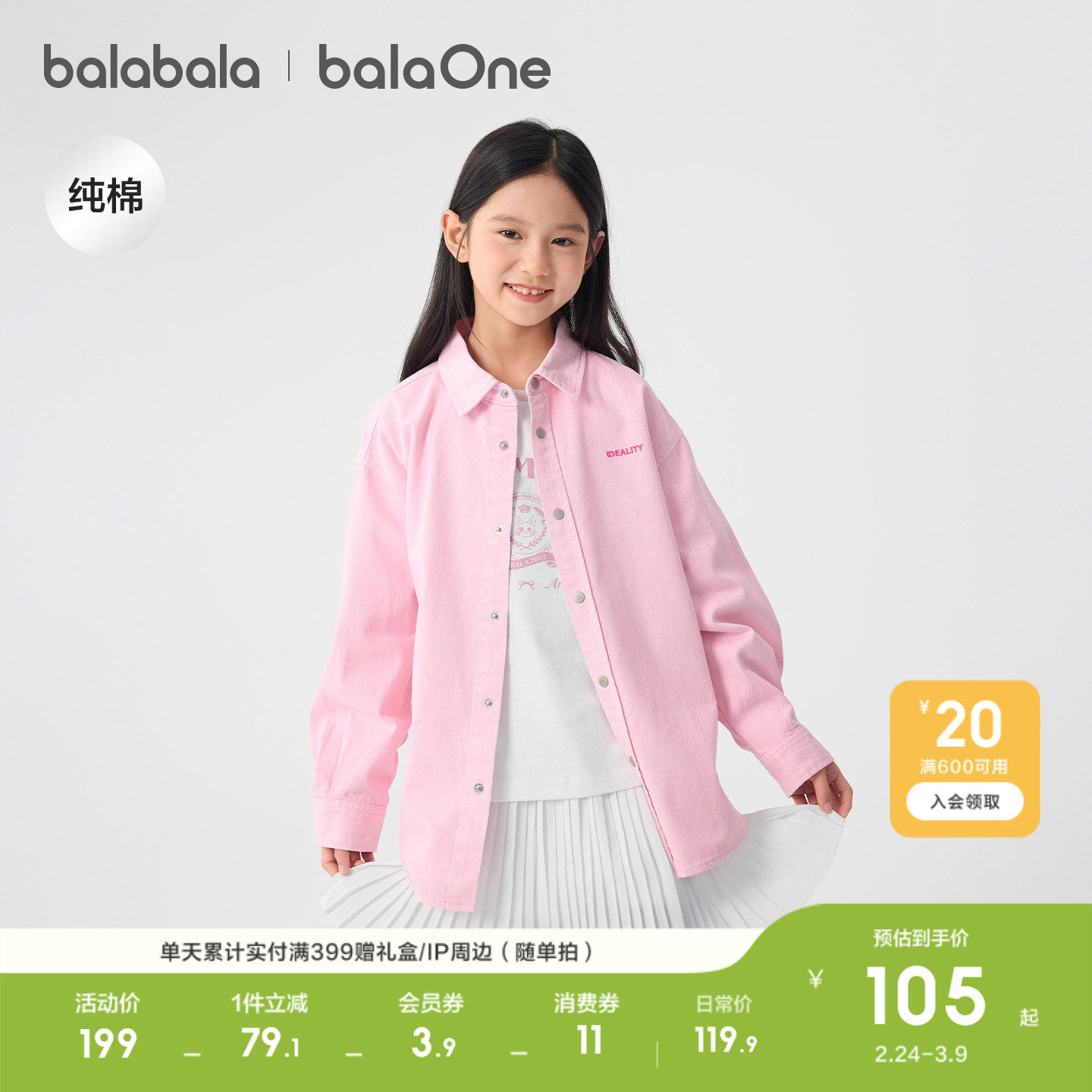 巴拉巴拉童装儿童长袖衬衫女童男童2026新款春装牛仔上衣纯棉舒适