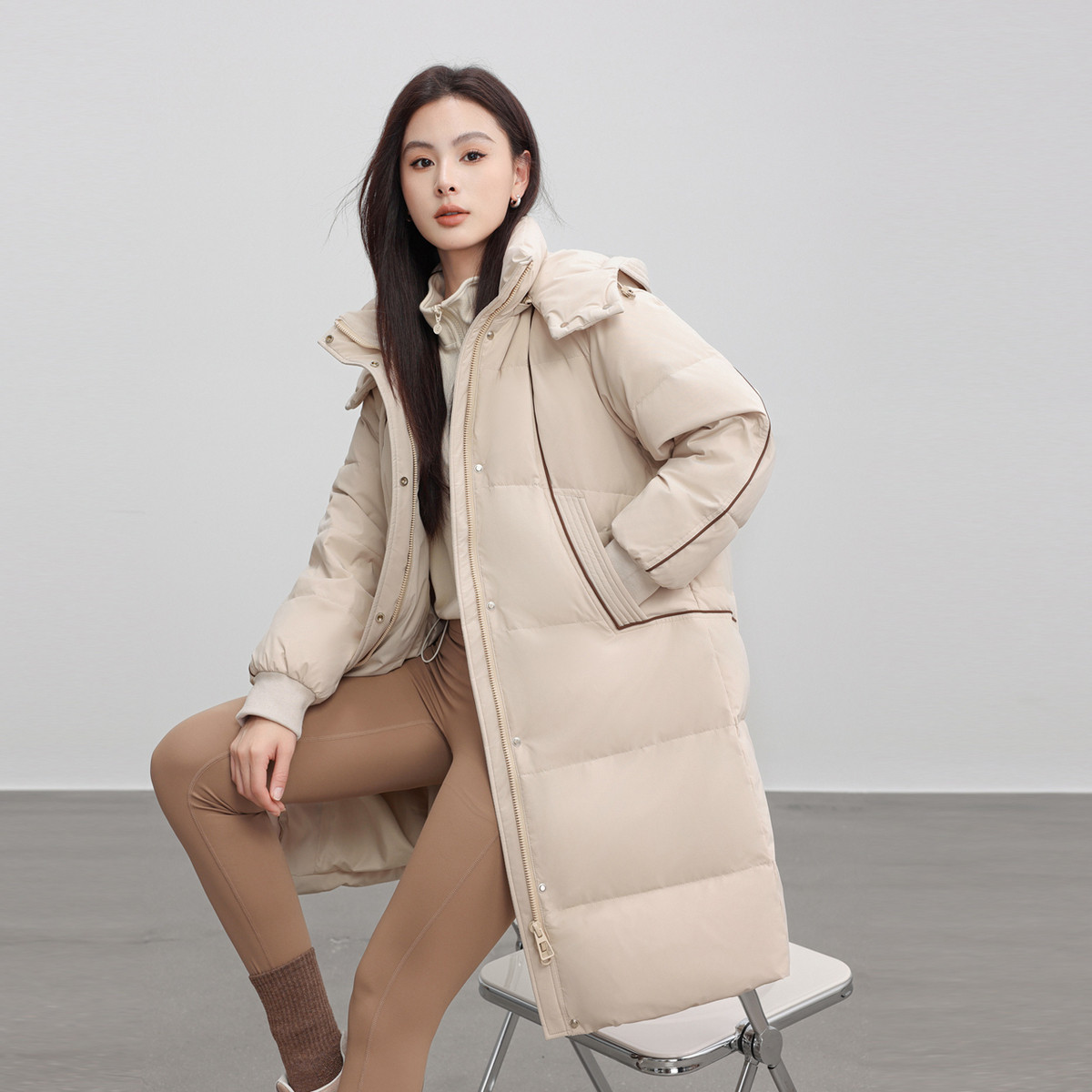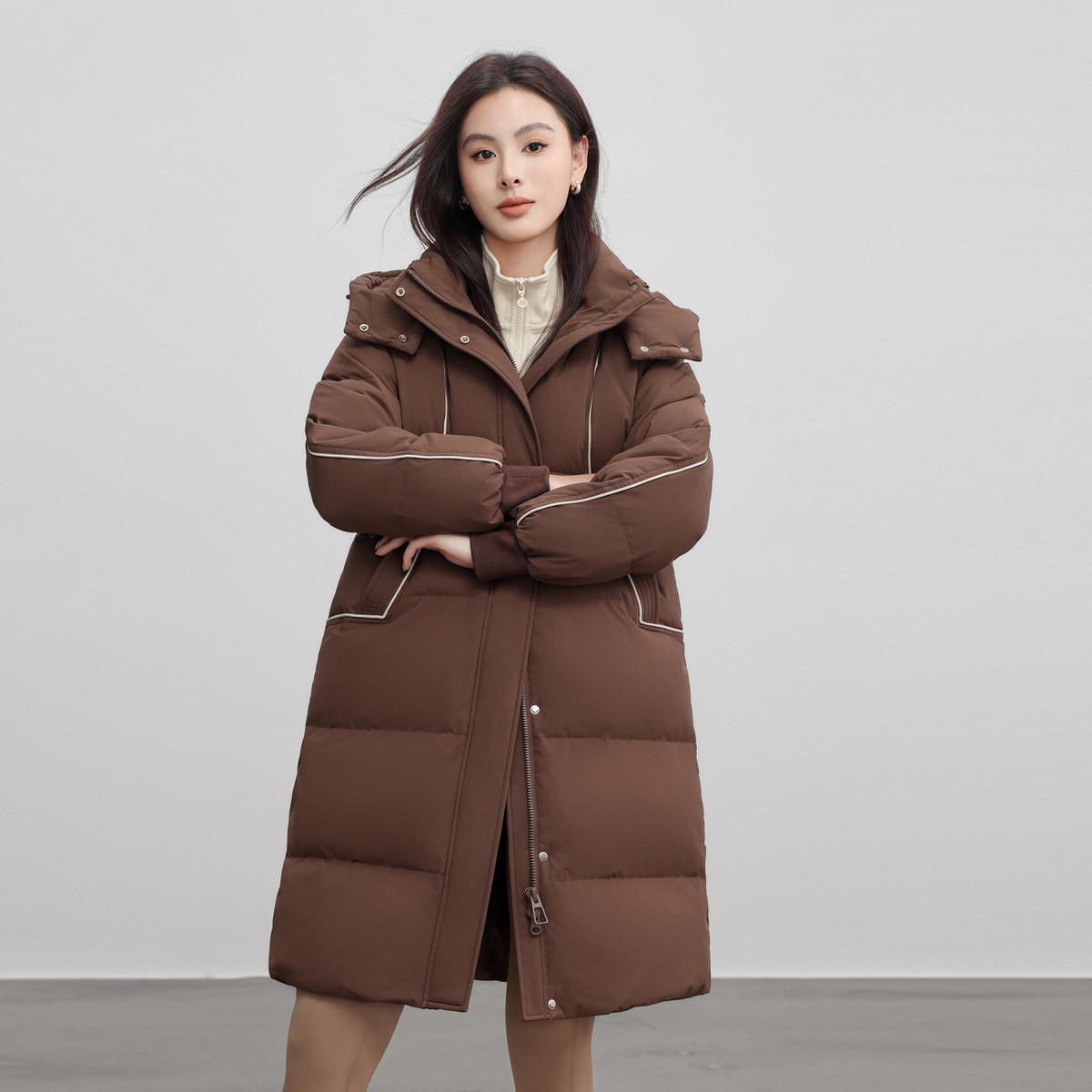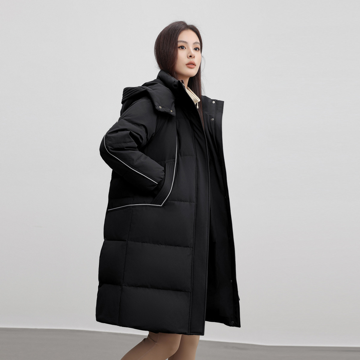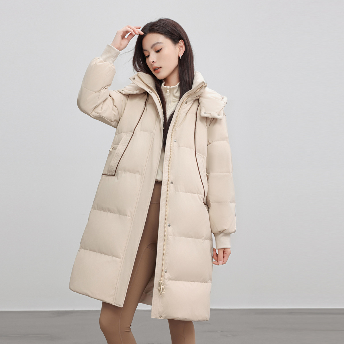 雪中飞2026春新款女士中长款羽绒服可脱卸帽保暖甜美纯色廓形