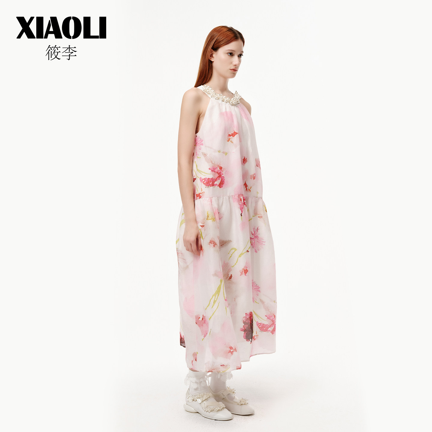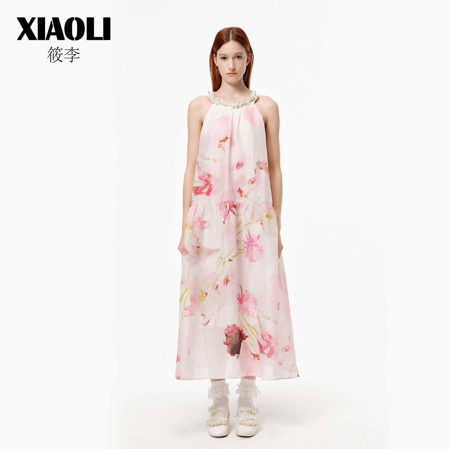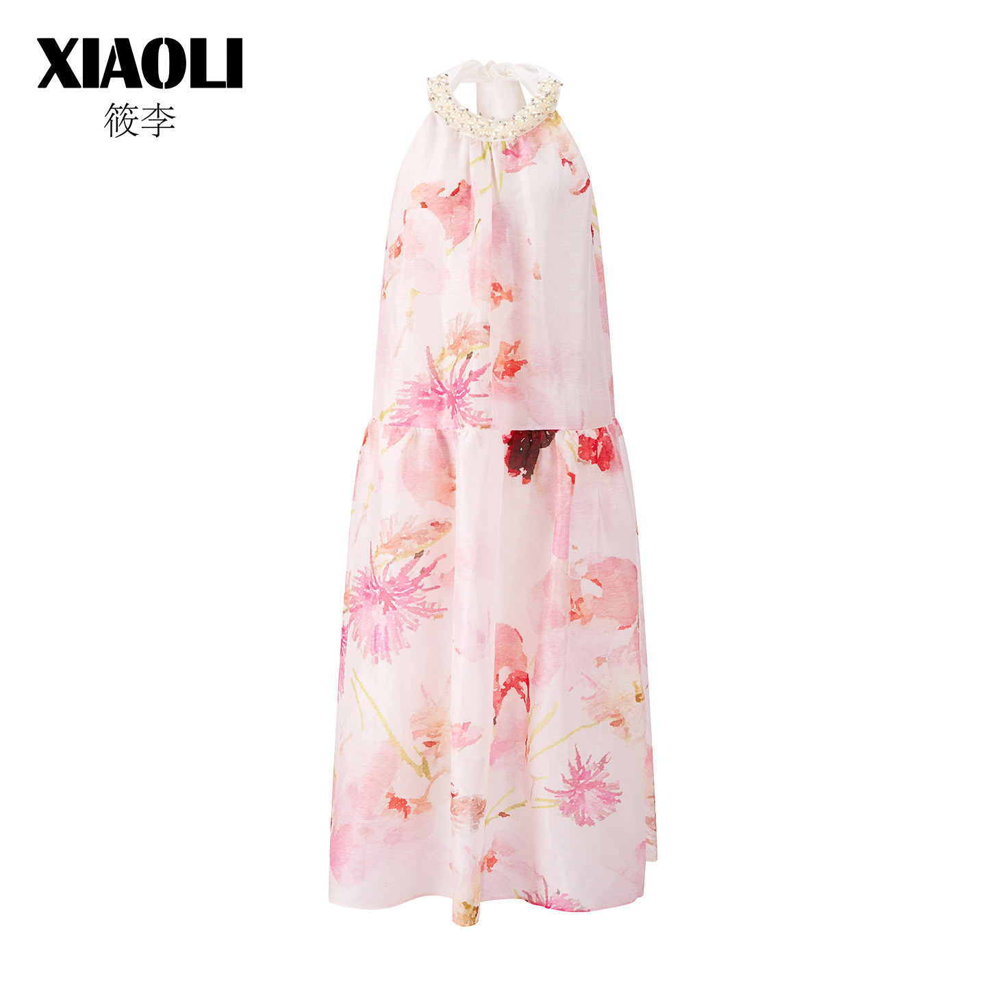 XIAOLI筱李春夏甜美度假风优雅粉色印花挂脖无袖连衣裙女春新品