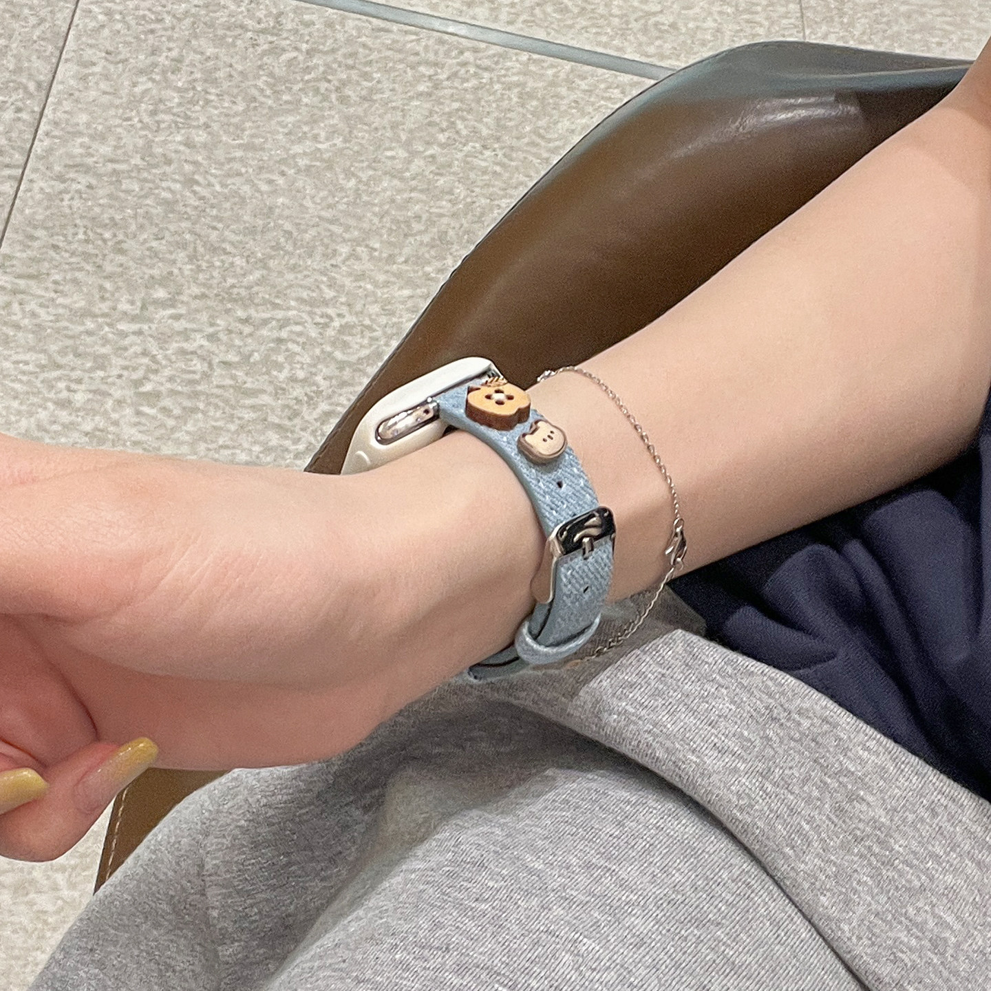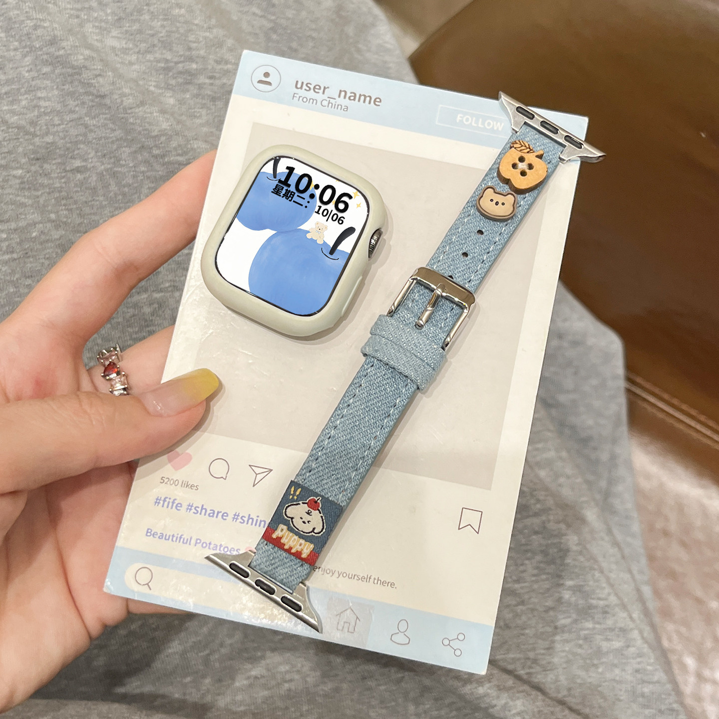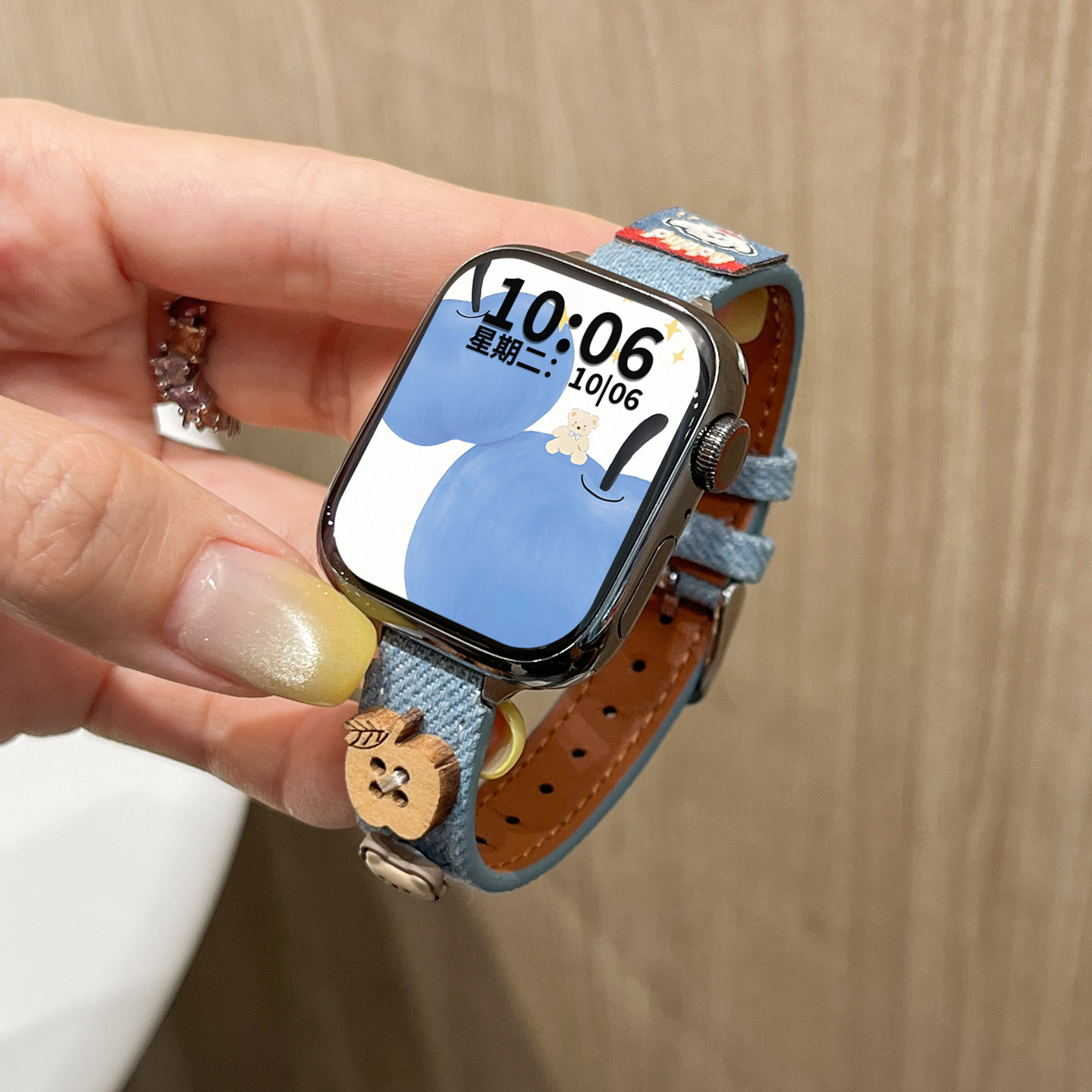适用小米手环苹果小熊牛仔布皮质表带