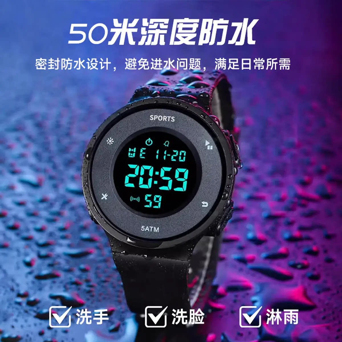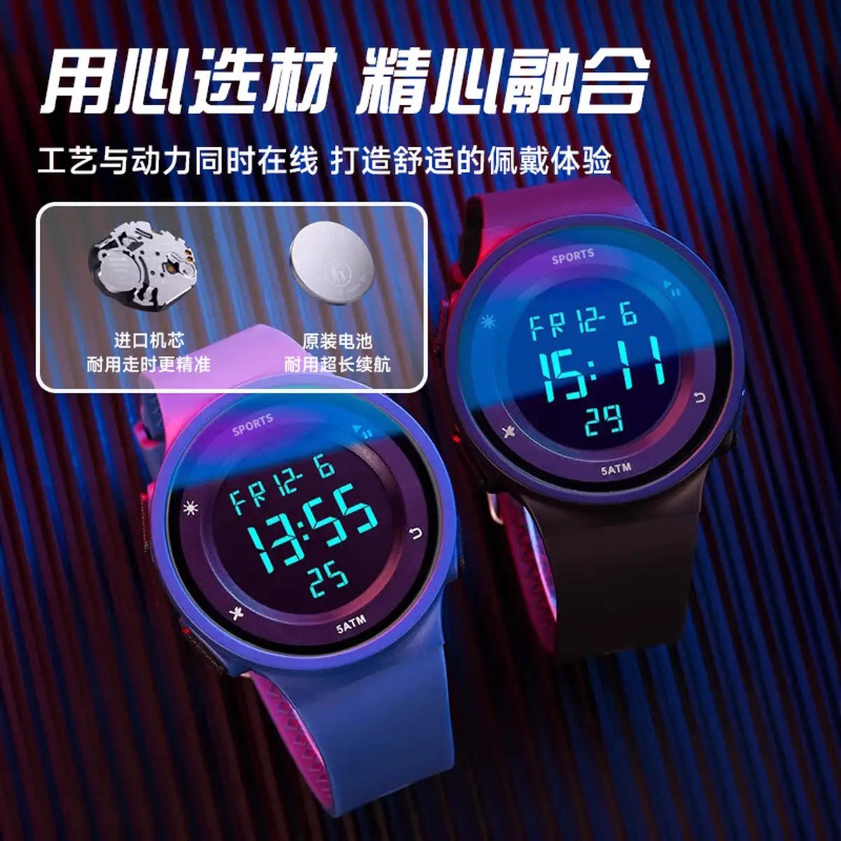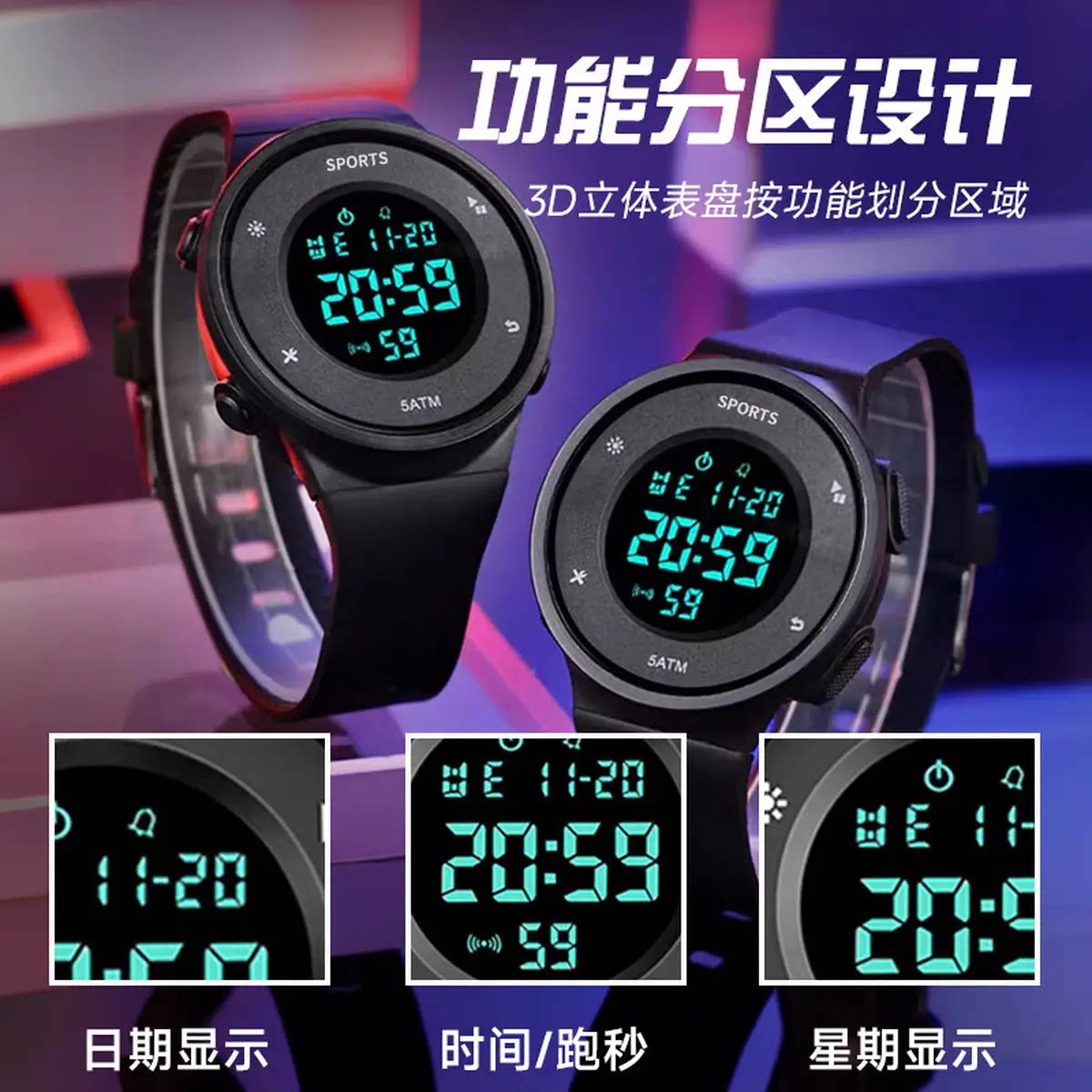 时刻美简约双时间防水运动初高中学生电子手表多功能夜光男女手表