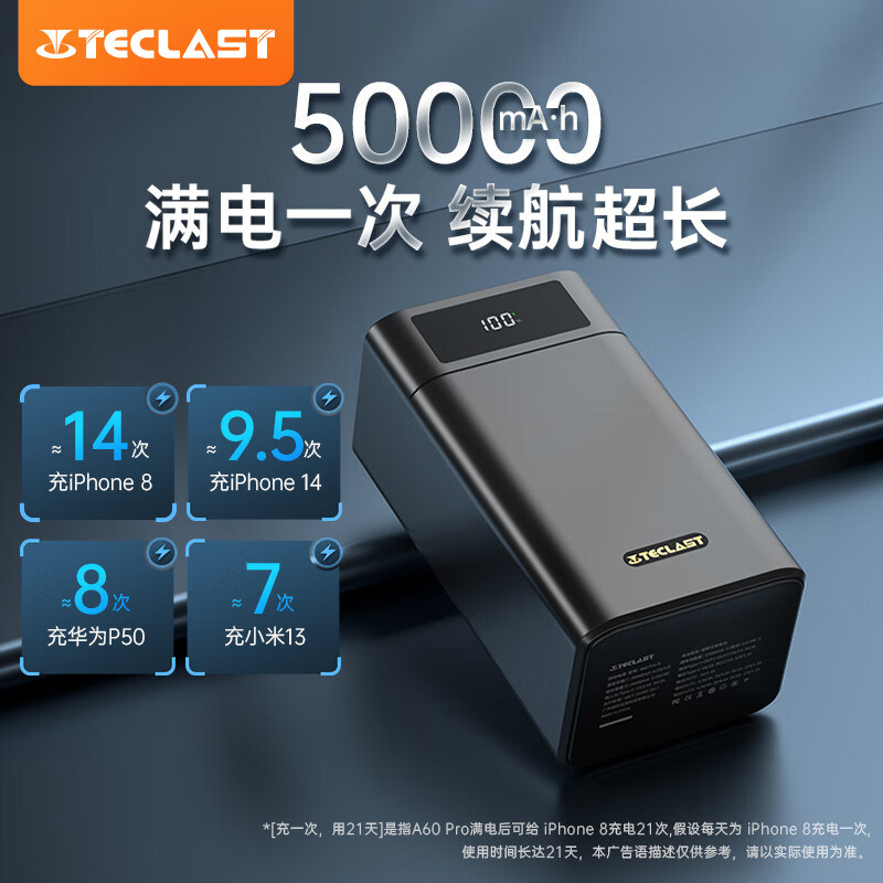 【3c认证】台电TECLAST充电宝50000毫安大容量22.5w快充便捷式移动电源户外露营直播摆摊适用苹果17华为小米