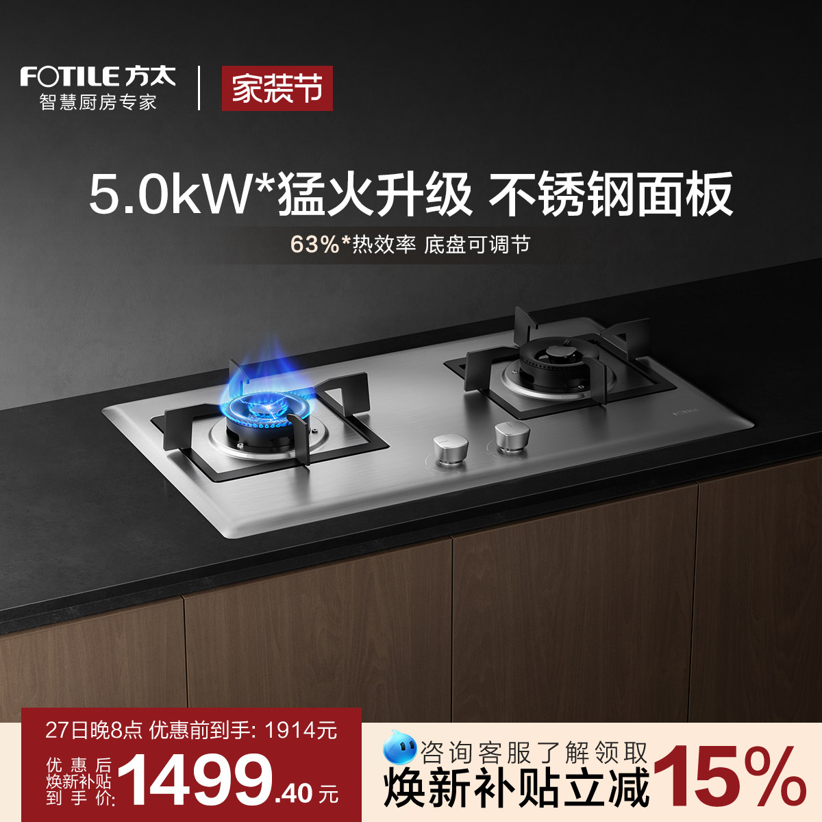 方太02-TH25G不锈钢燃气灶煤气灶双灶台嵌入式灶具家用官方旗舰店