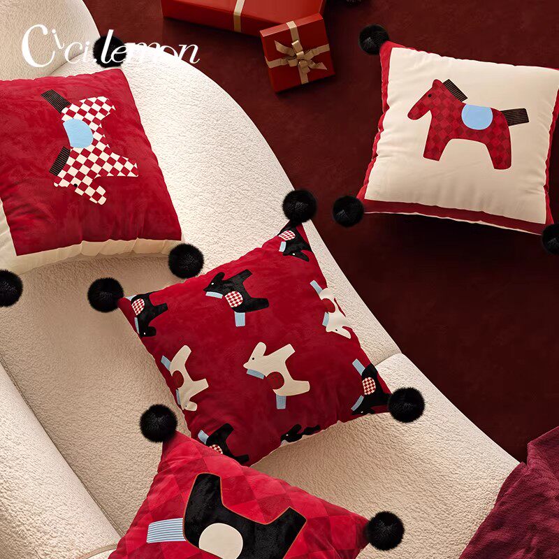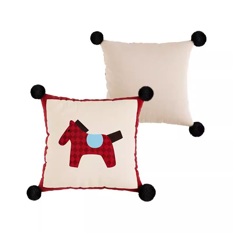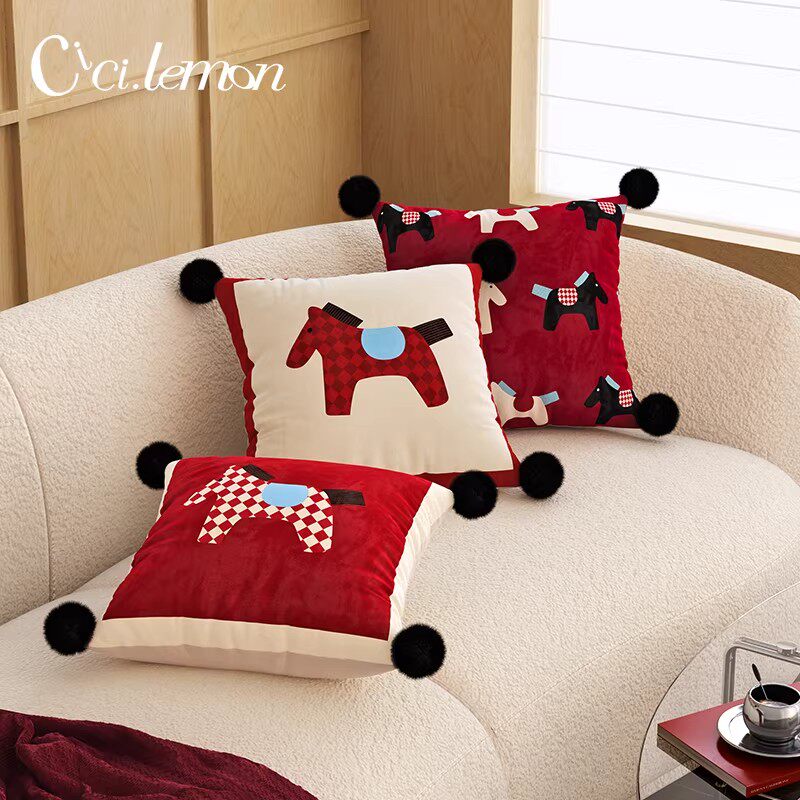 马来有福红色小马抱枕沙发客厅轻奢高级感毛绒可爱新年氛围靠背枕