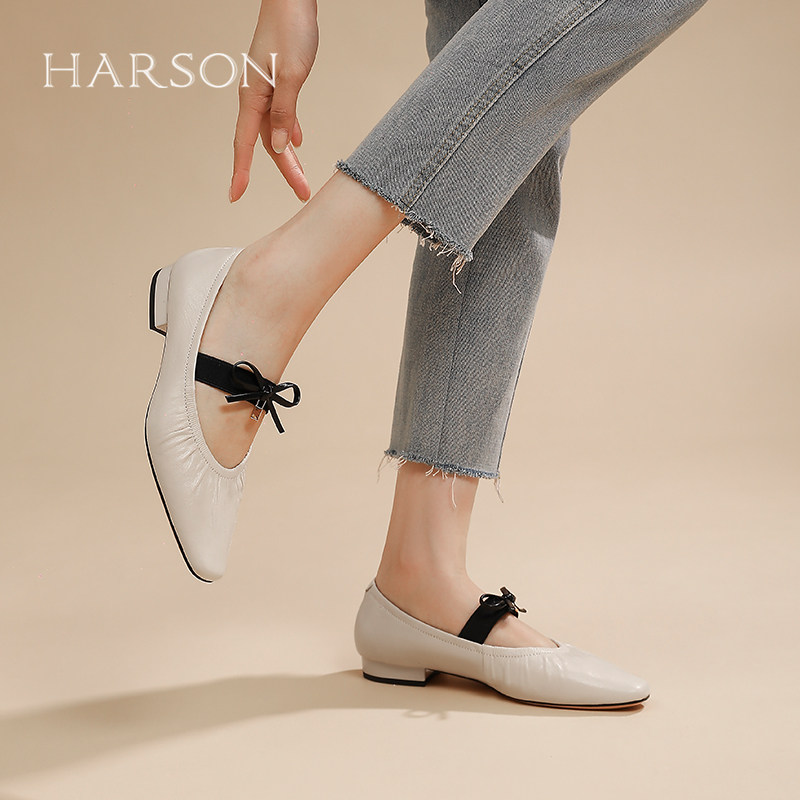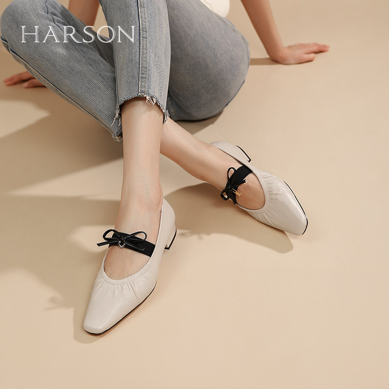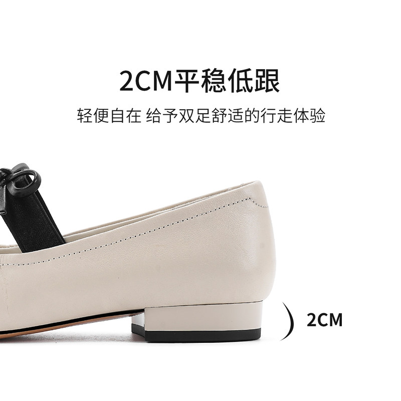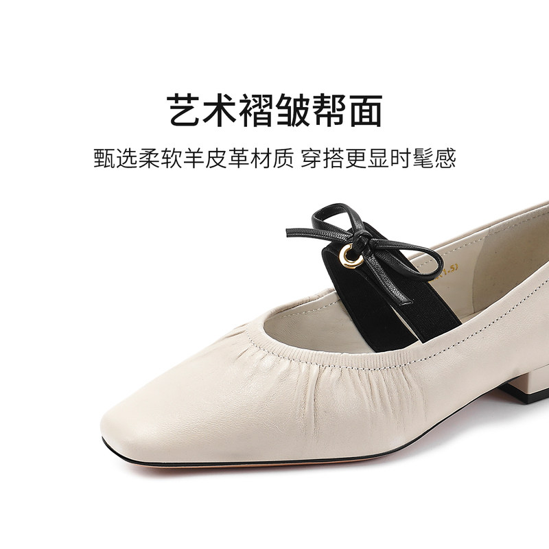 哈森法式方头粗跟玛丽珍鞋女士真皮系带蝴蝶结浅口单鞋HWS250151