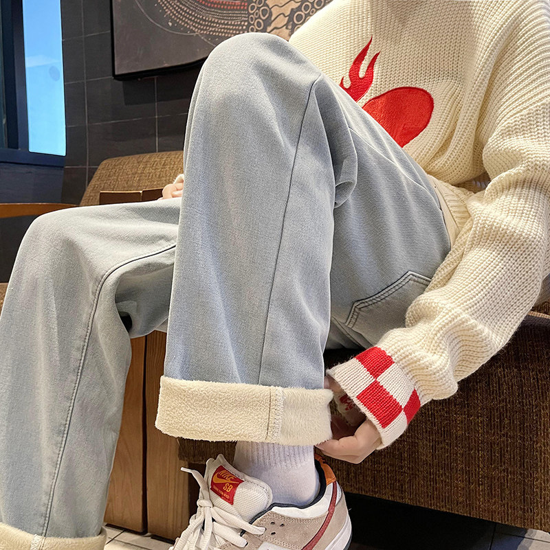 NEVERNEED原色加绒直筒牛仔裤男女冬季美式潮牌cleanfit宽松A字裤