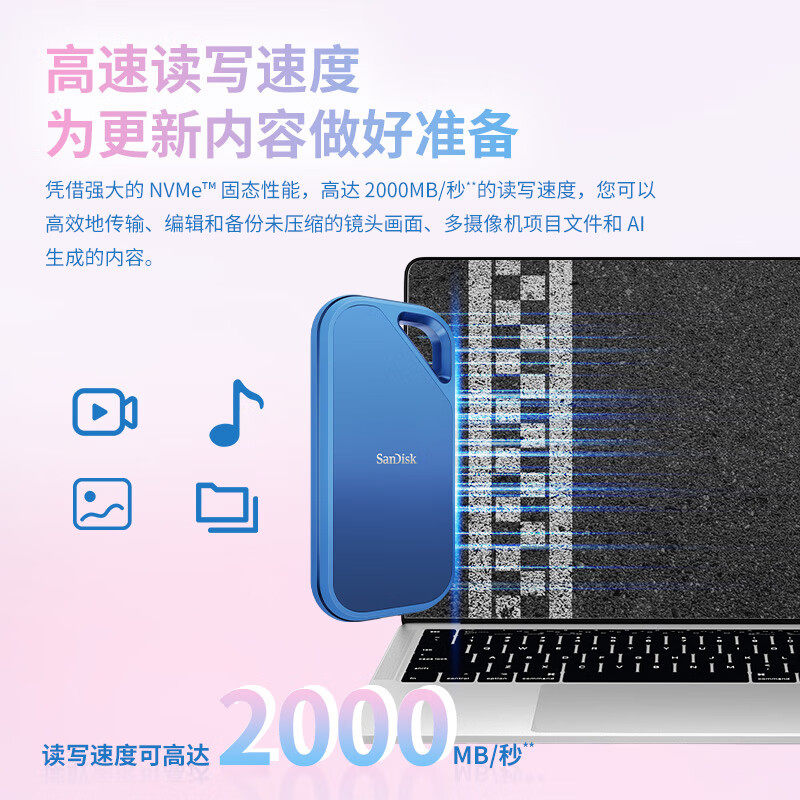 闪迪创作者系列1TB移动固态硬盘读写同速2000MB/s便携扩容神器