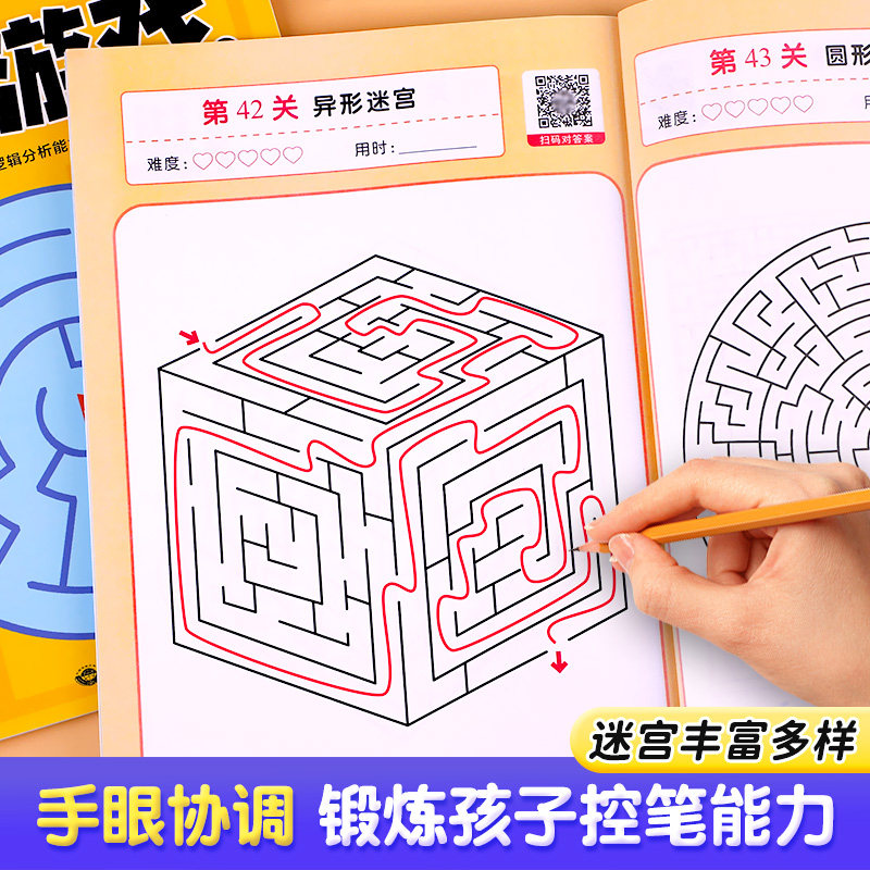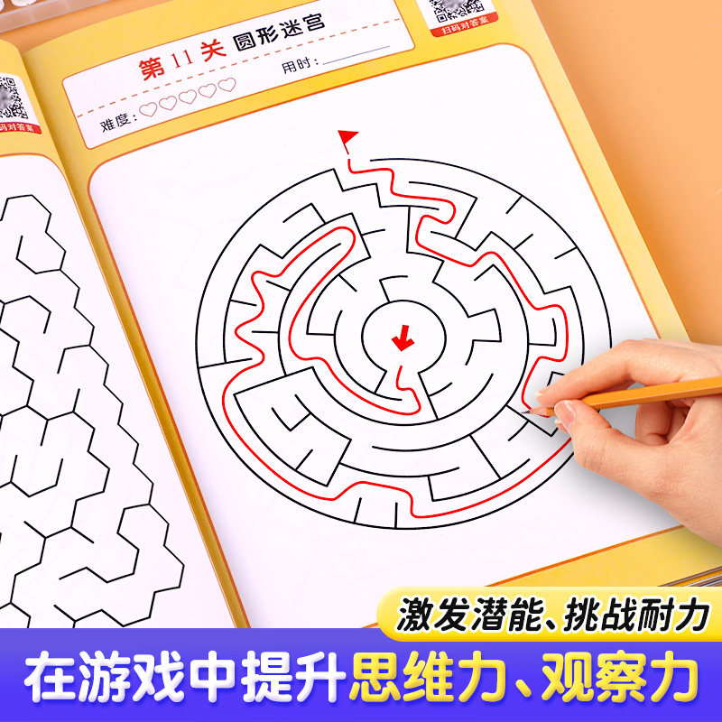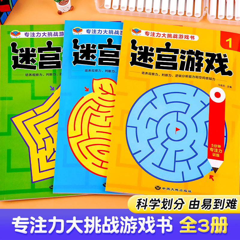 专注力大挑战游戏书全套3册 迷宫游戏1+2+3 适合2-3一6-8岁宝宝左右脑开发思维训练书 分级训练零基础低难度高难度练习册走迷宫