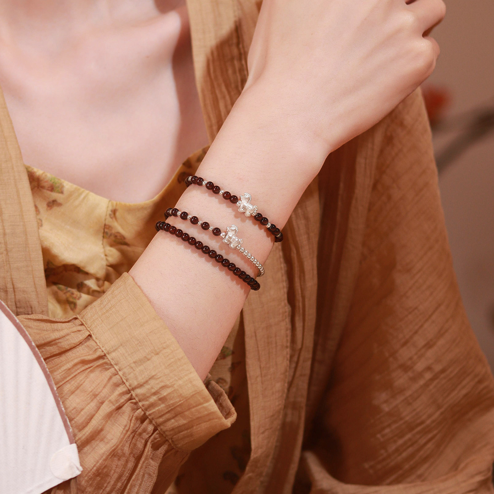 普陀山文创集天然石榴石手串女款全净体官方旗舰三圈水晶手链礼物