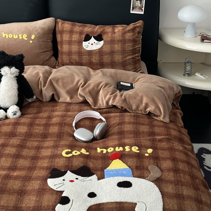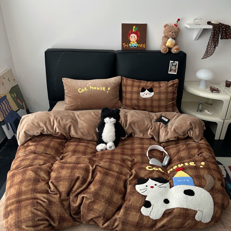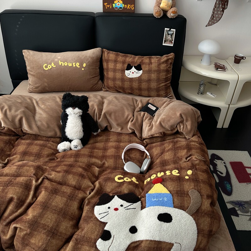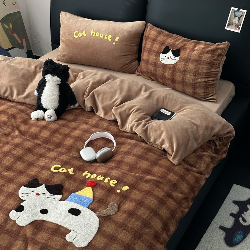 美拉德小猫牛奶绒四件套卡通珊瑚绒被套加厚保暖床单人宿舍三件套