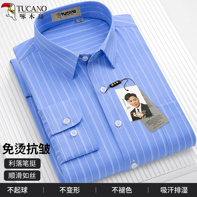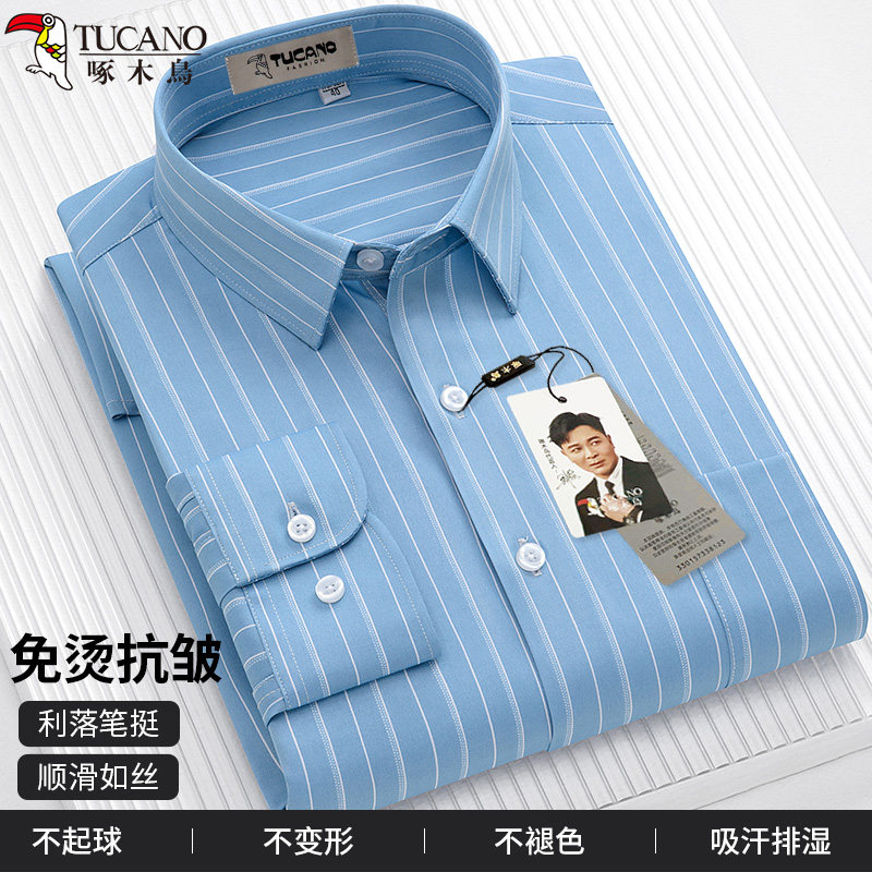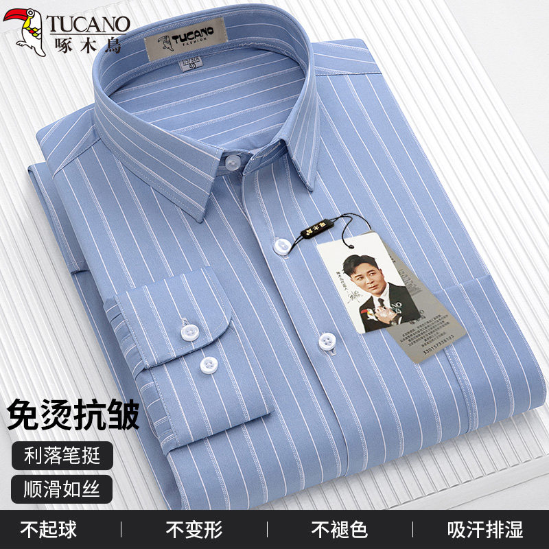 啄木鸟男士长袖经典条纹衬衫春夏薄款免烫抗皱商务休闲男白色上衣
