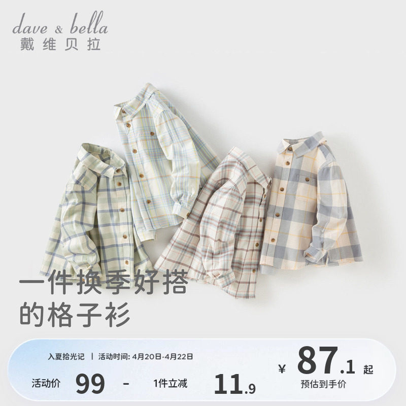 戴维贝拉男童衬衫2026春装新款儿童外套格子宝宝长袖衬衣上衣童装