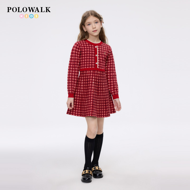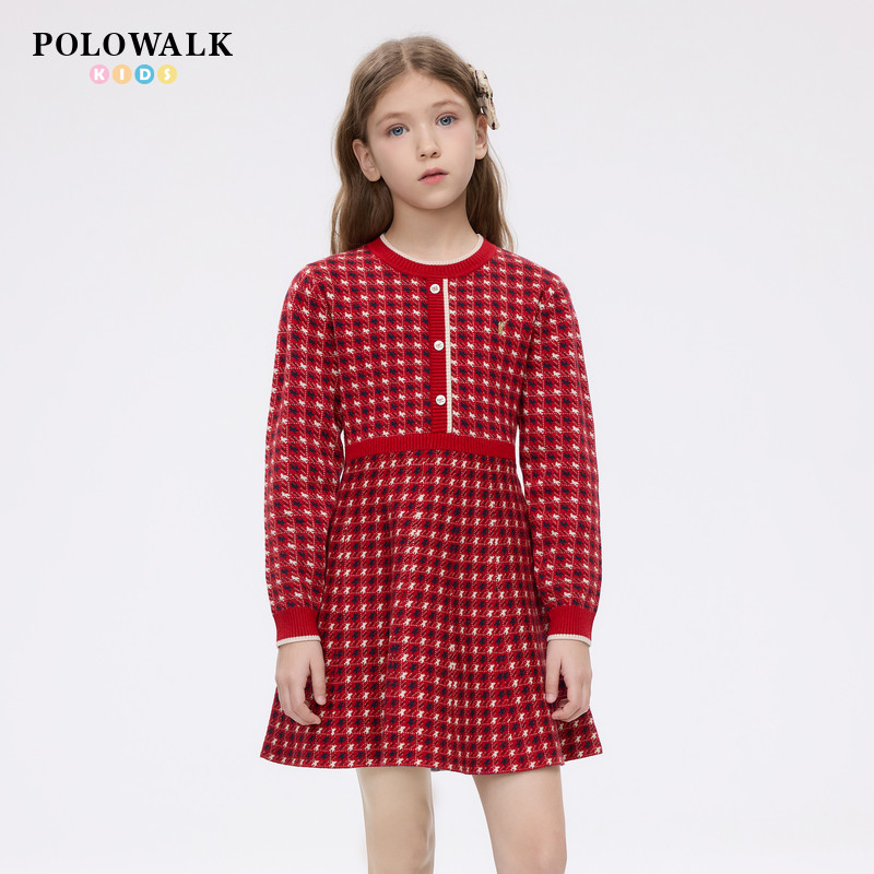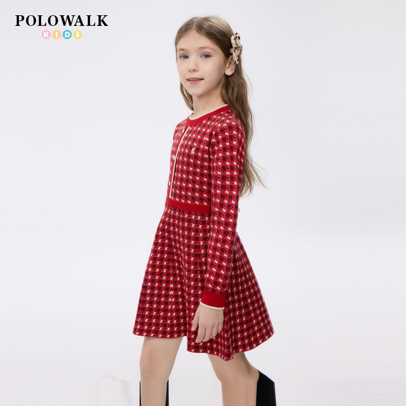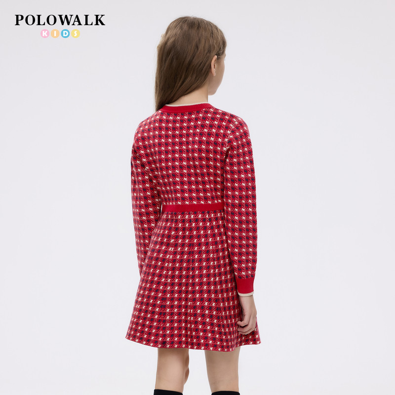 POLOWALK童装女童连衣裙2025秋冬新款红色毛衣千鸟格针织裙子