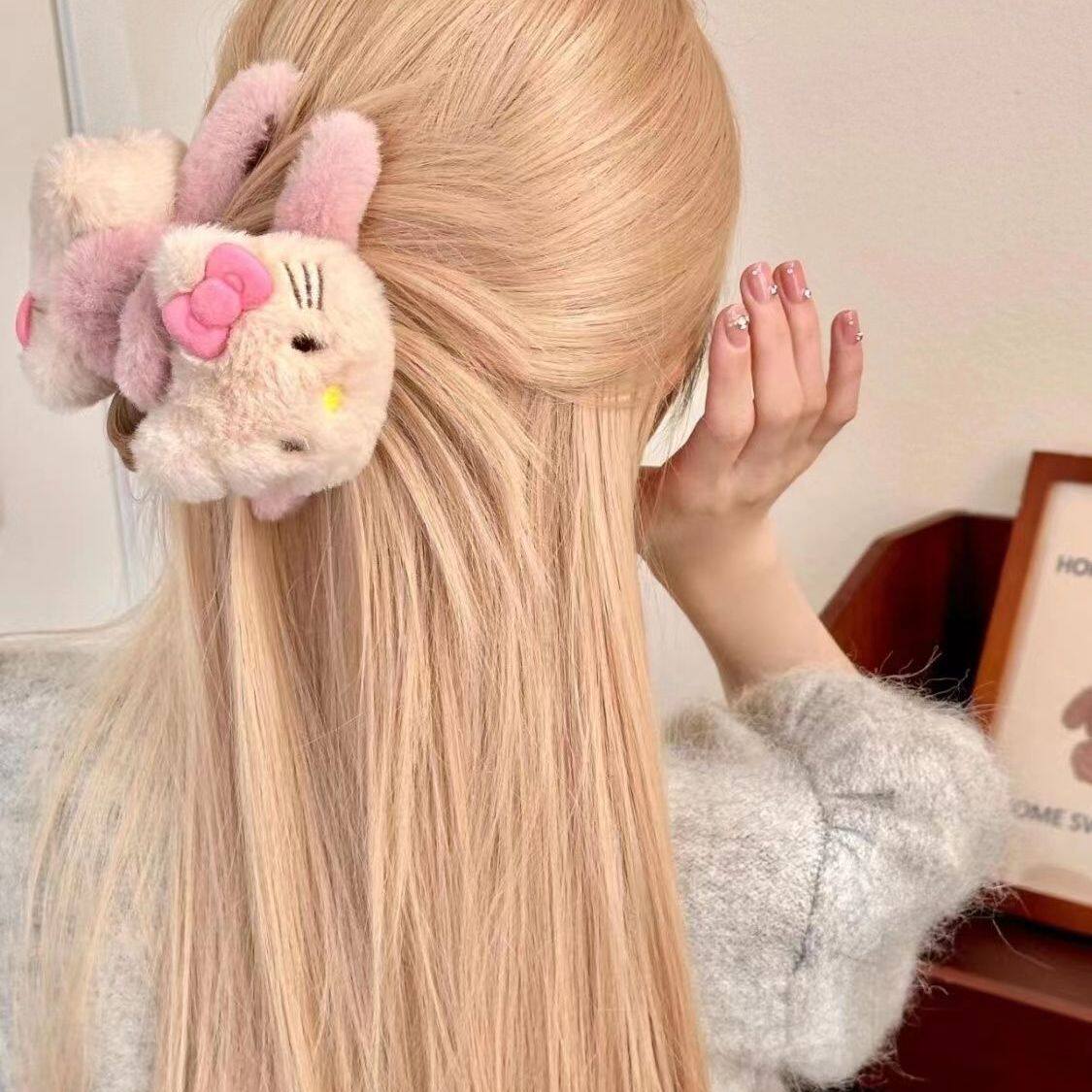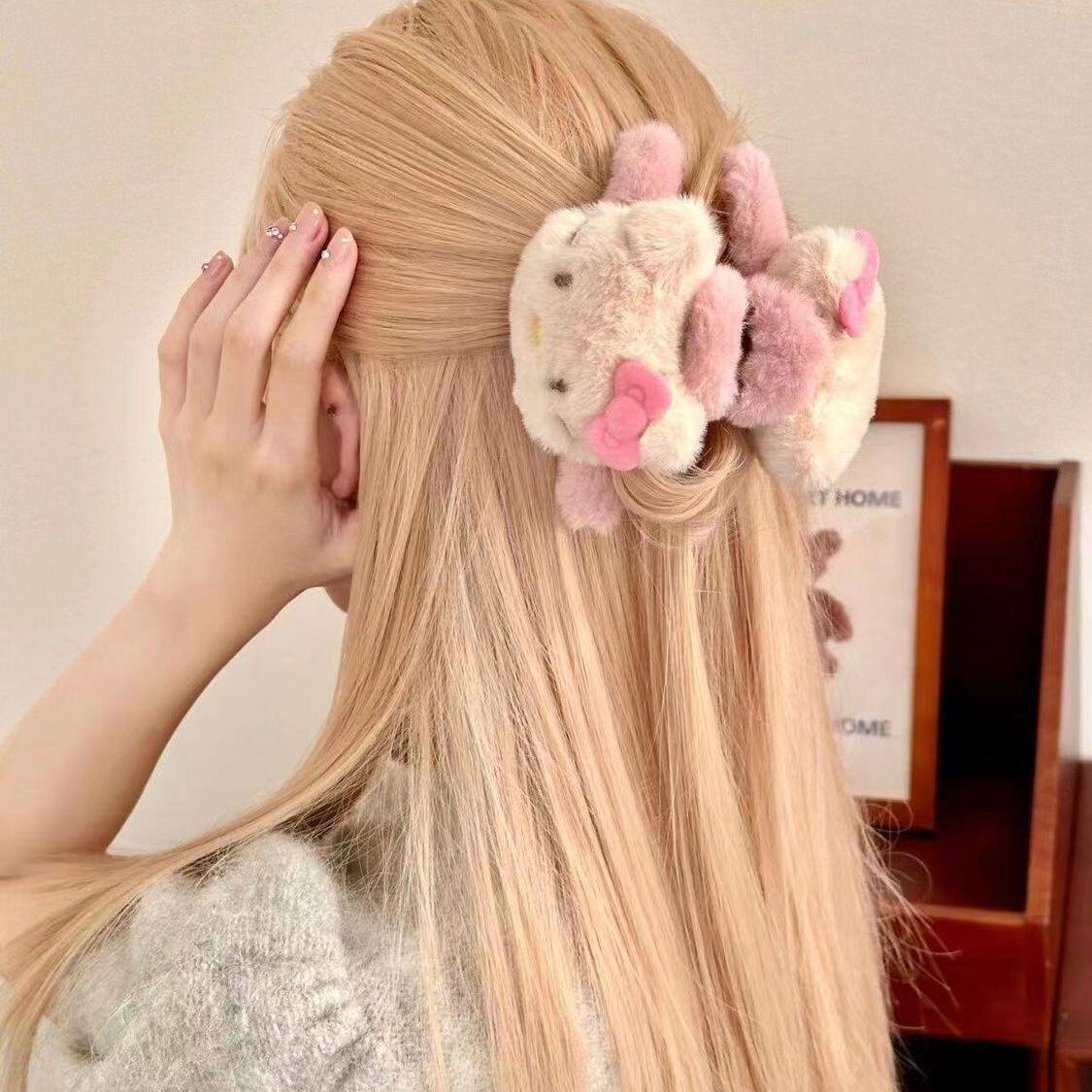 可爱毛绒kt猫抓夹鲨鱼夹甜美少女心后脑勺盘发夹子大号发量多发饰